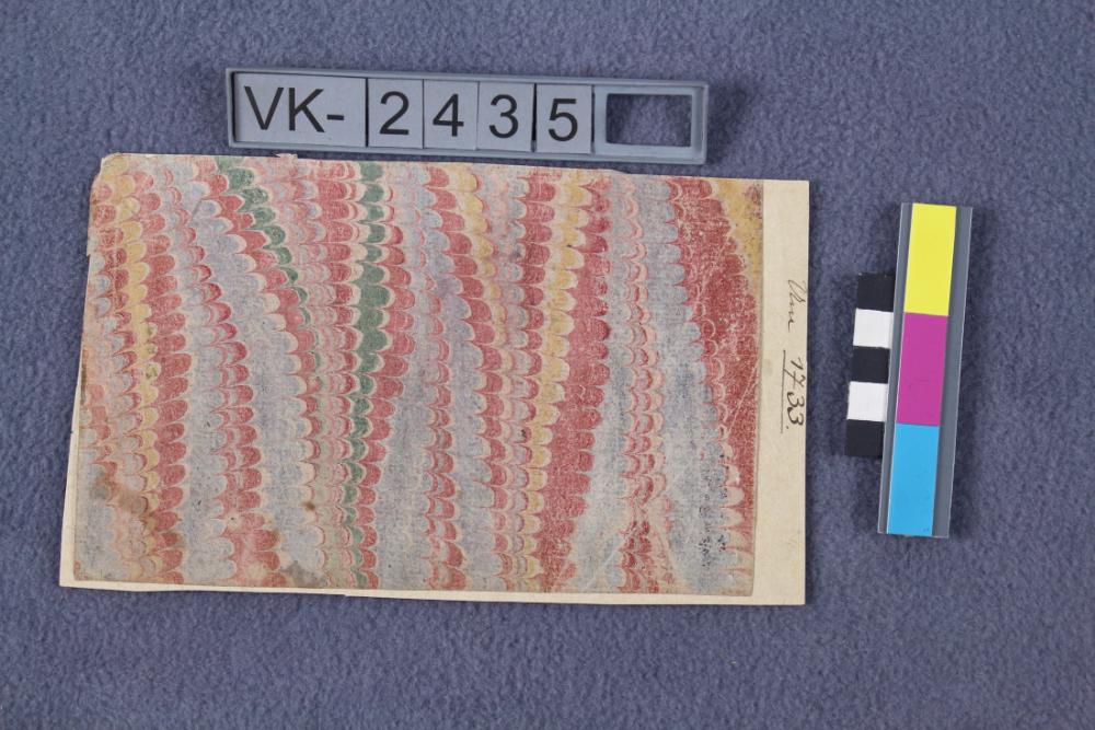 Rechteckiges ausgeschnittenes Stück einer Tapete. Muster: Marmoriert in rot, blau, gelb und grün.