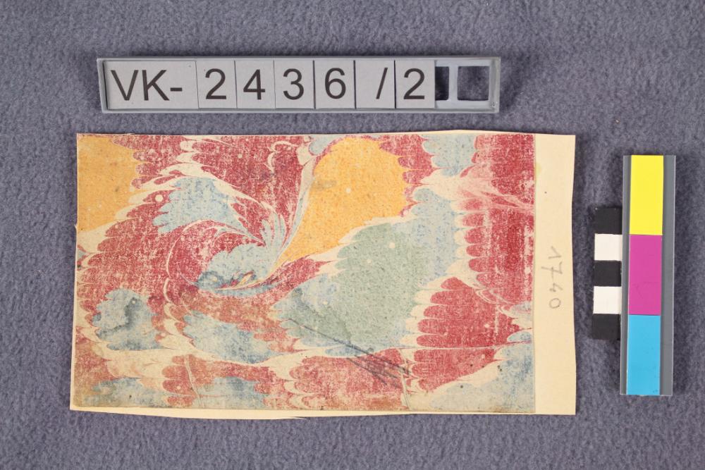 Rechteckiges ausgeschnittenes Stück einer Tapete. Muster: Marmoriert in blau, rot und gelb auf weiß.