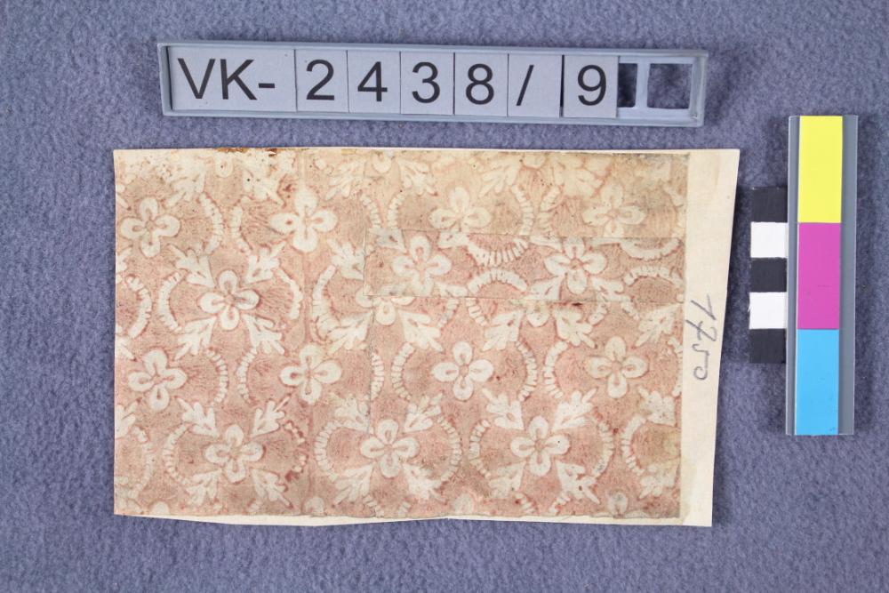 Rechteckiges ausgeschnittenes Stück einer Tapete. Muster: Vierblättrige Blüten mit Blättern und Wellenlinien, gedruckt in rotbraun. Ähnlich wie VK-2444_8 (allerdings dort mit 1780 datiert).