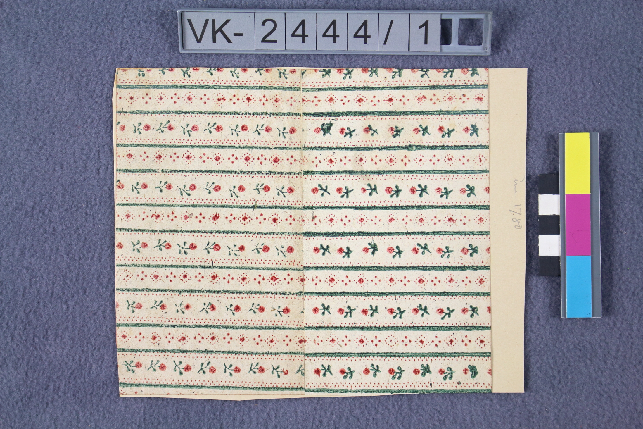 Rechteckiges ausgeschnittenes Stück einer Tapete. Muster: Abwechselnd stilisiert florale und geometrische Musterstreifen in rot und grün. Wie VK-2444_9.
