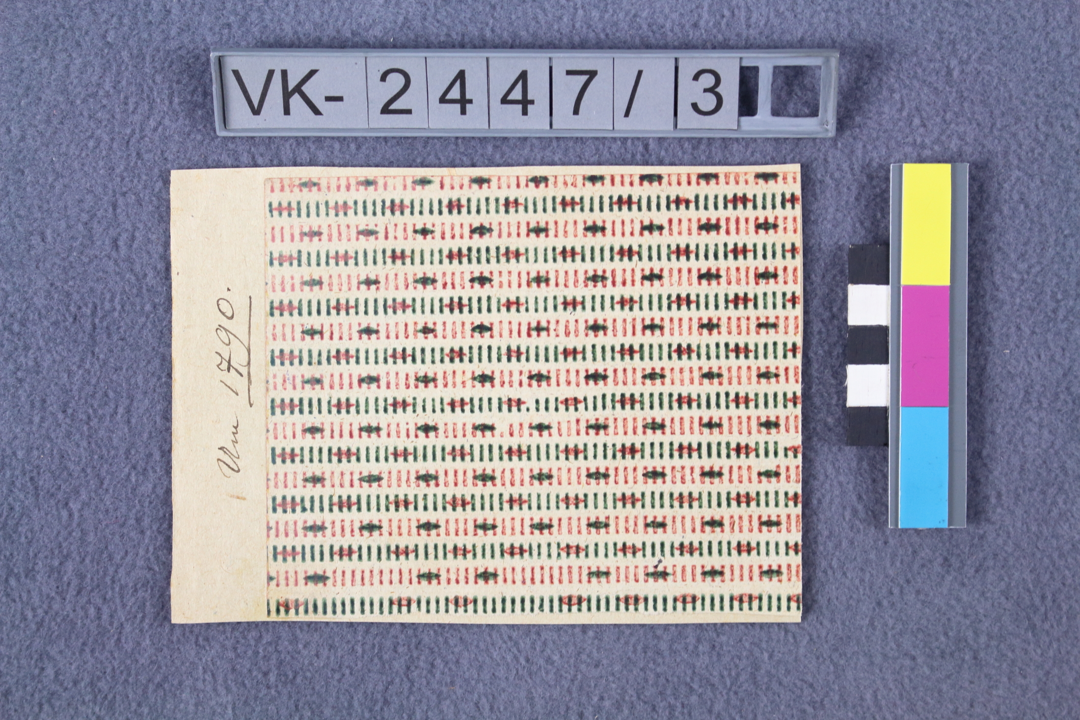 Rechteckiges ausgeschnittenes Stück einer Tapete. Muster: Schmale rote und grüne Balkenstreifen mit Linsenelementen.