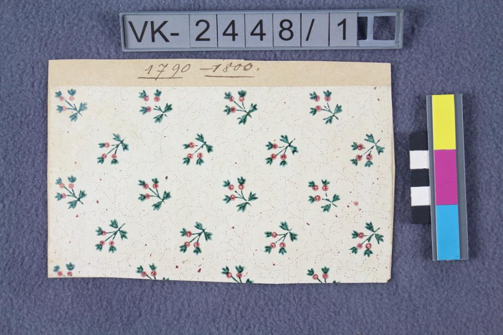 Rechteckiges ausgeschnittenes Stück einer Tapete. Muster: Blütenformen mit Blattwerk in rot und grün, dazwischen feine gepunktete rote Ranken. Wie VK-2447_6 und VK-2438_8 (allerdings dort mit 1750 datiert) und VK-2432_1 (allerdings dort mit 1730 datiert).