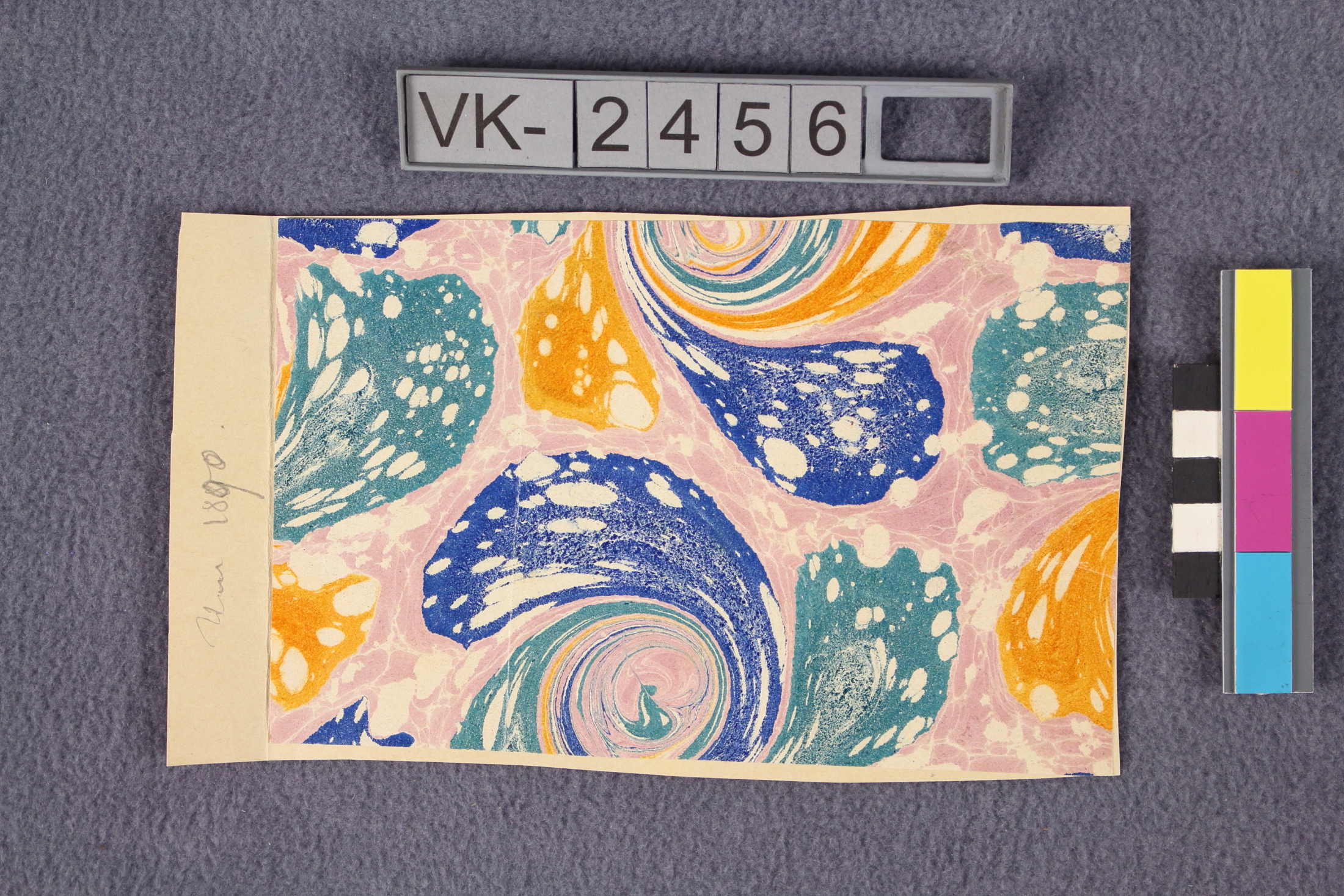 Rechteckiges ausgeschnittenes Stück einer Tapete. Muster: Marmoriert in rosa, blau, gelb und grün auf weiß.