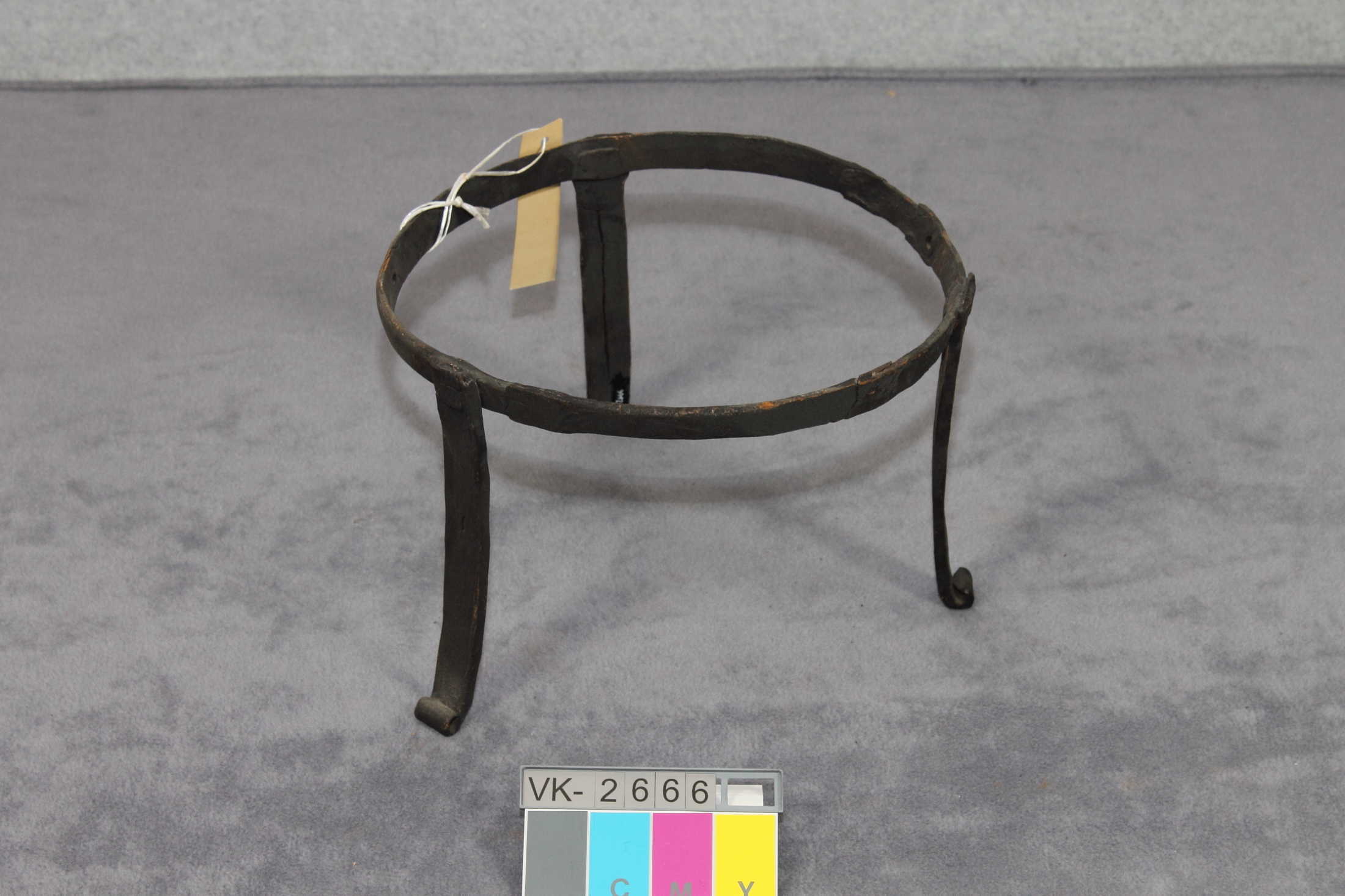 Dreifuß aus einem Eisenring mit drei Füßen, deren Enden umgelegt sind.