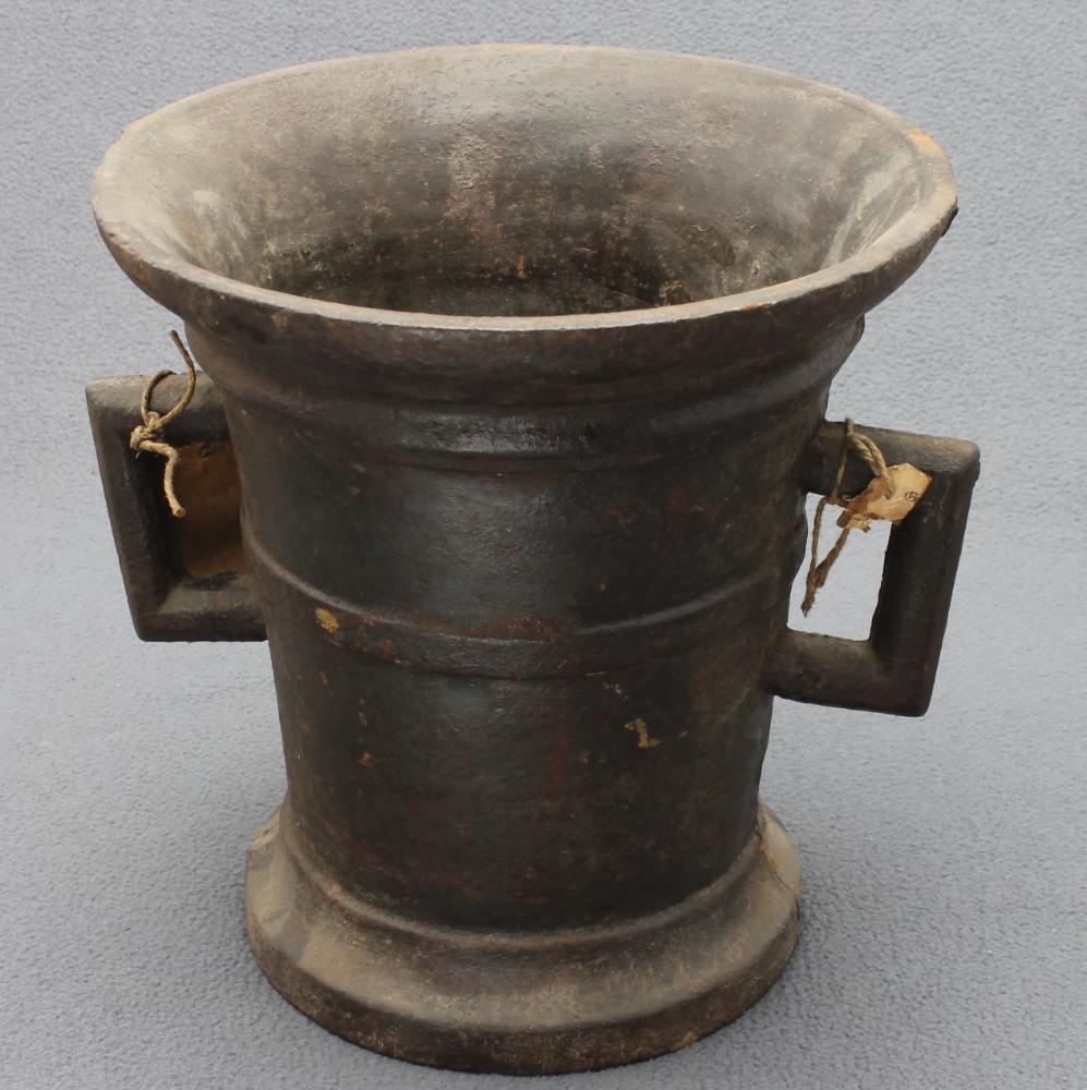 Gusseiserner Mörser mit Wulstverzierungen und zwei eckigen Handhaben. Der Mörser hat eine eingegossene Beschriftung: "HOL".