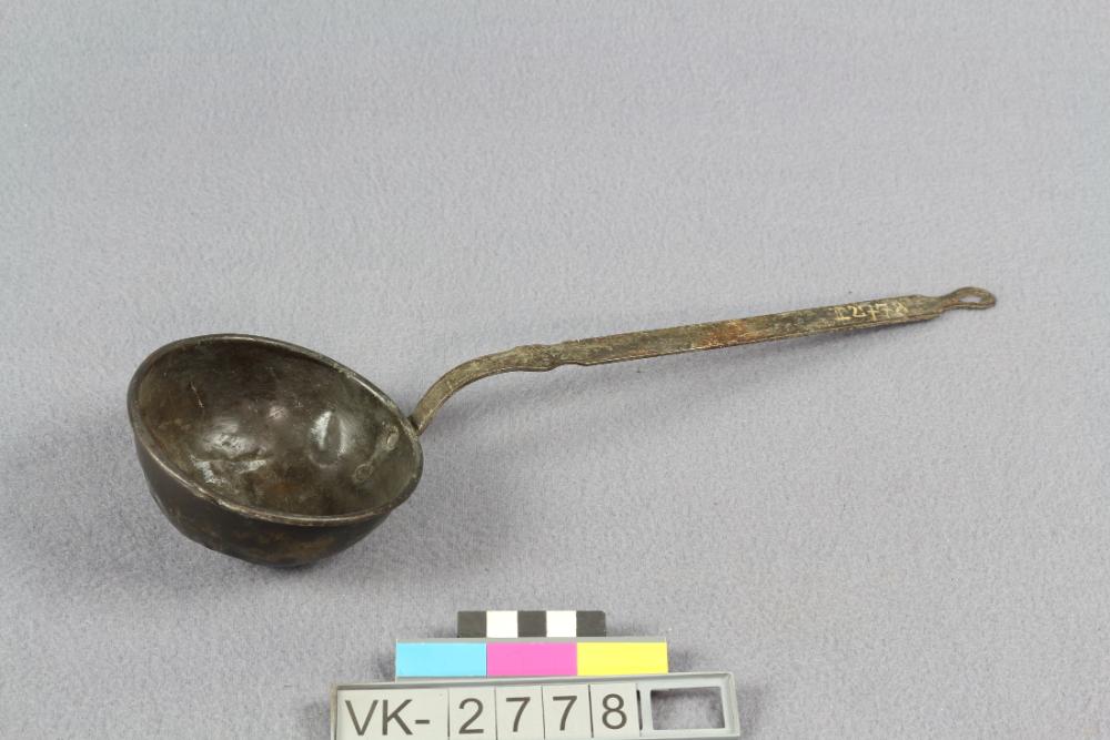Schöpfer mit annähernd geradem Stiel mit einer Aufhängeöse.