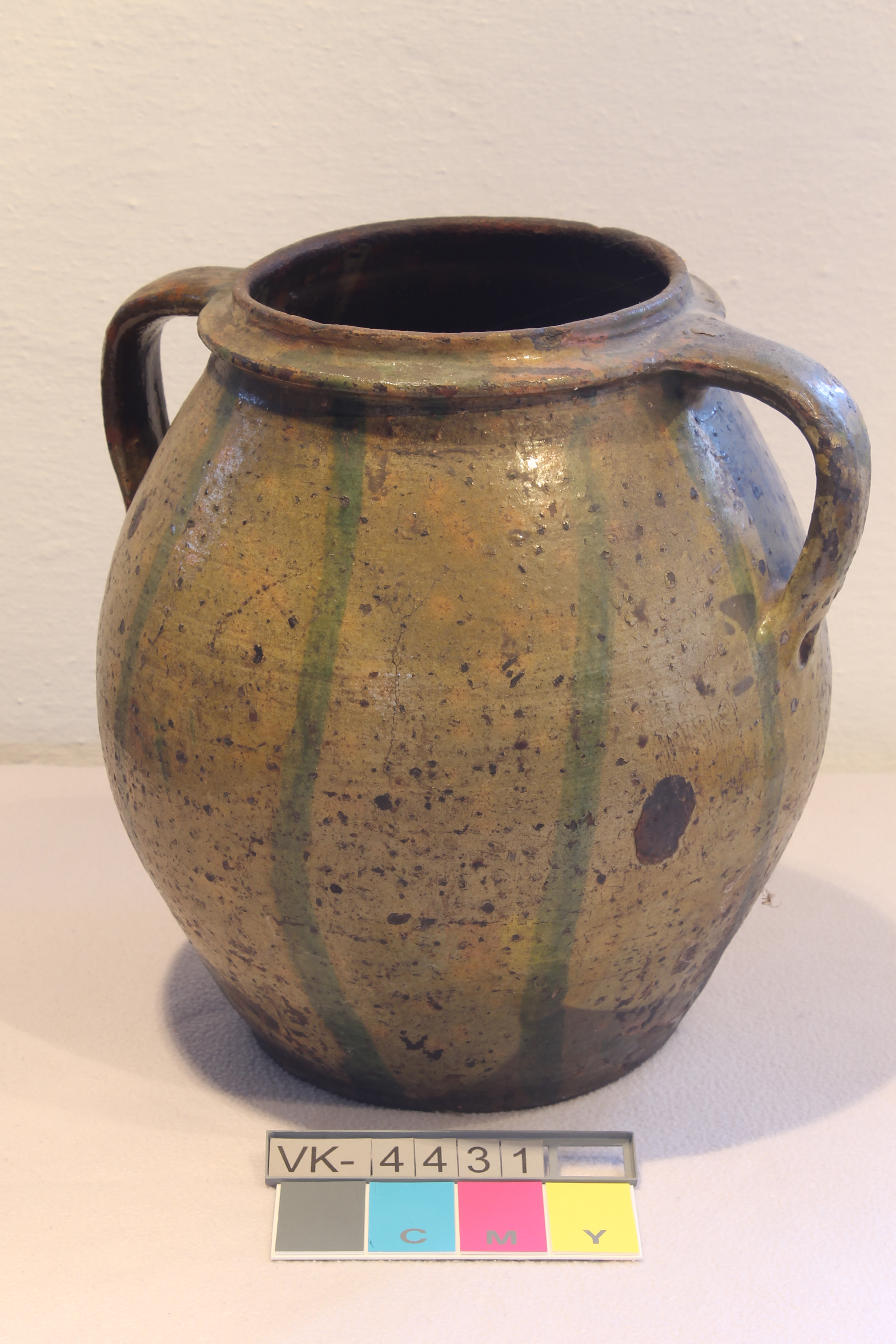 Bauchiger Schmalztopf mit zwei randständigen Henkeln und gelblicher Glasur mit unregelmäßigen grünen Streifen.