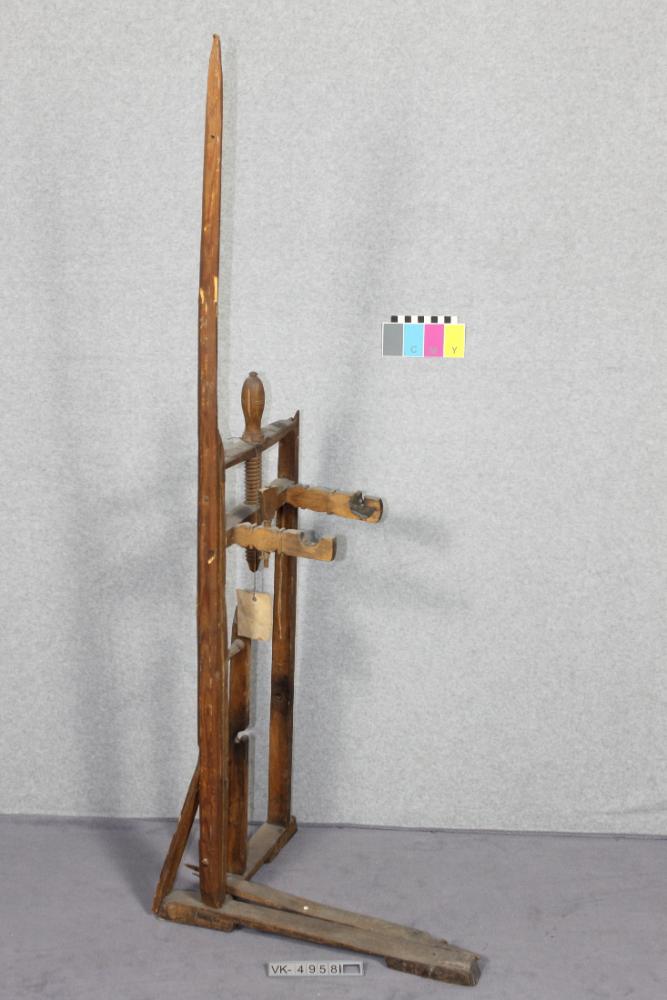Gestell eines fußbetriebenen Spinnrads mit verstellbarer Spulenaufnahme und einem Spinnrocken.