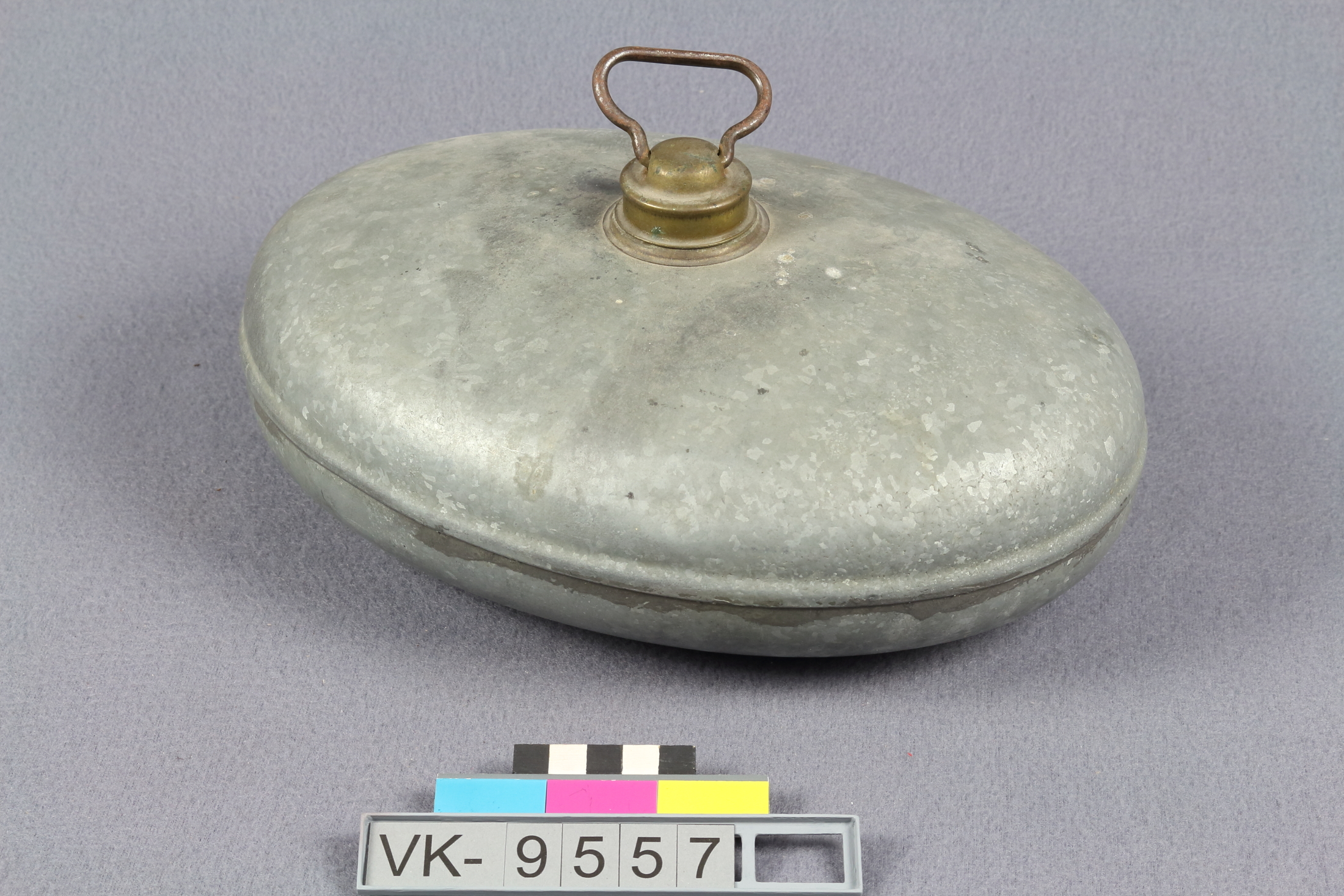 Ovale, flache, bauchige Wärmflasche aus Zinn mit einem Schraubdeckel.