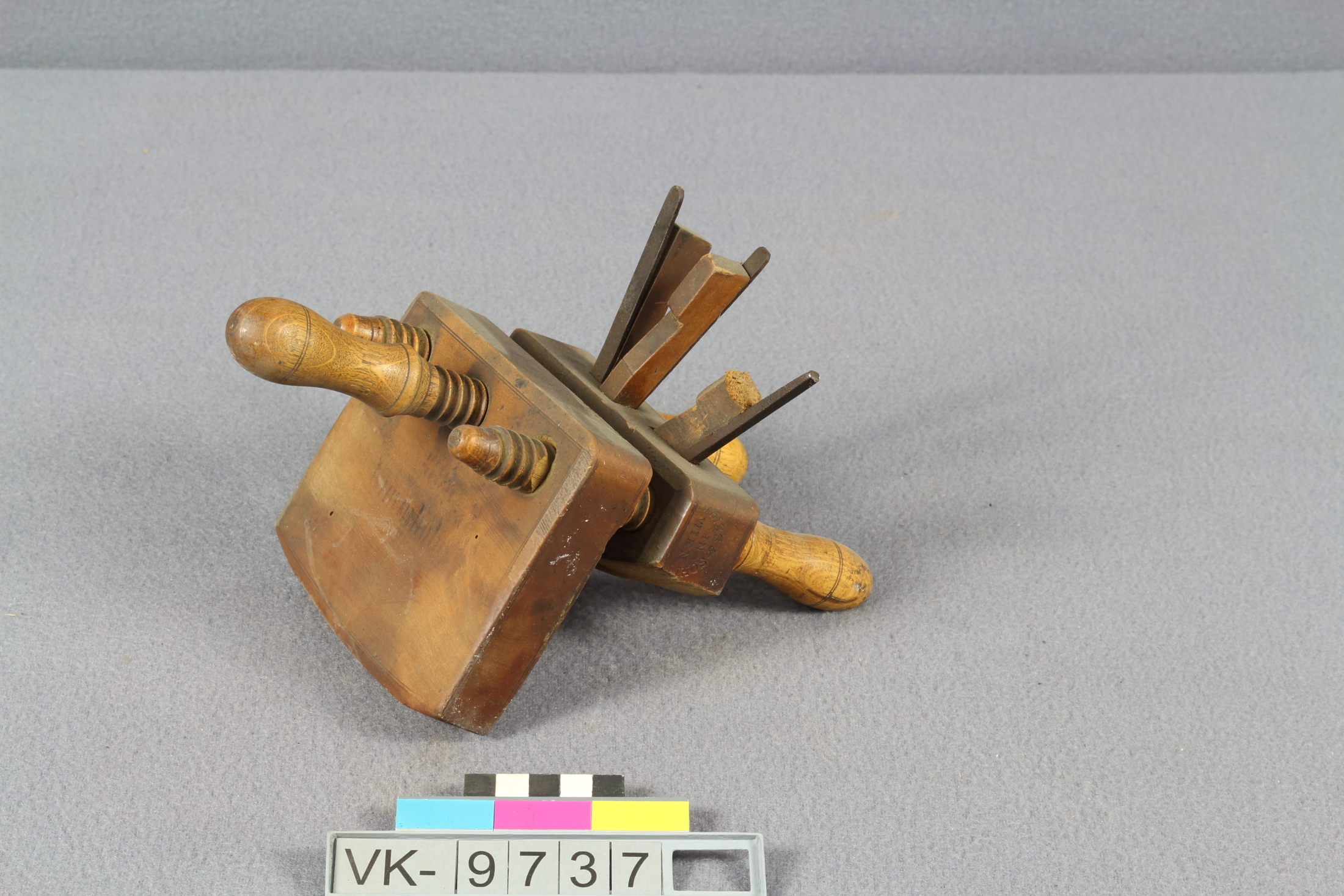 Nuthobel (Kimmhobel) mit drei Gewindestangen und einem schmalen Hobeleisen. Der Hobel hat eine eingeprägte Beschriftung des Herstellers.