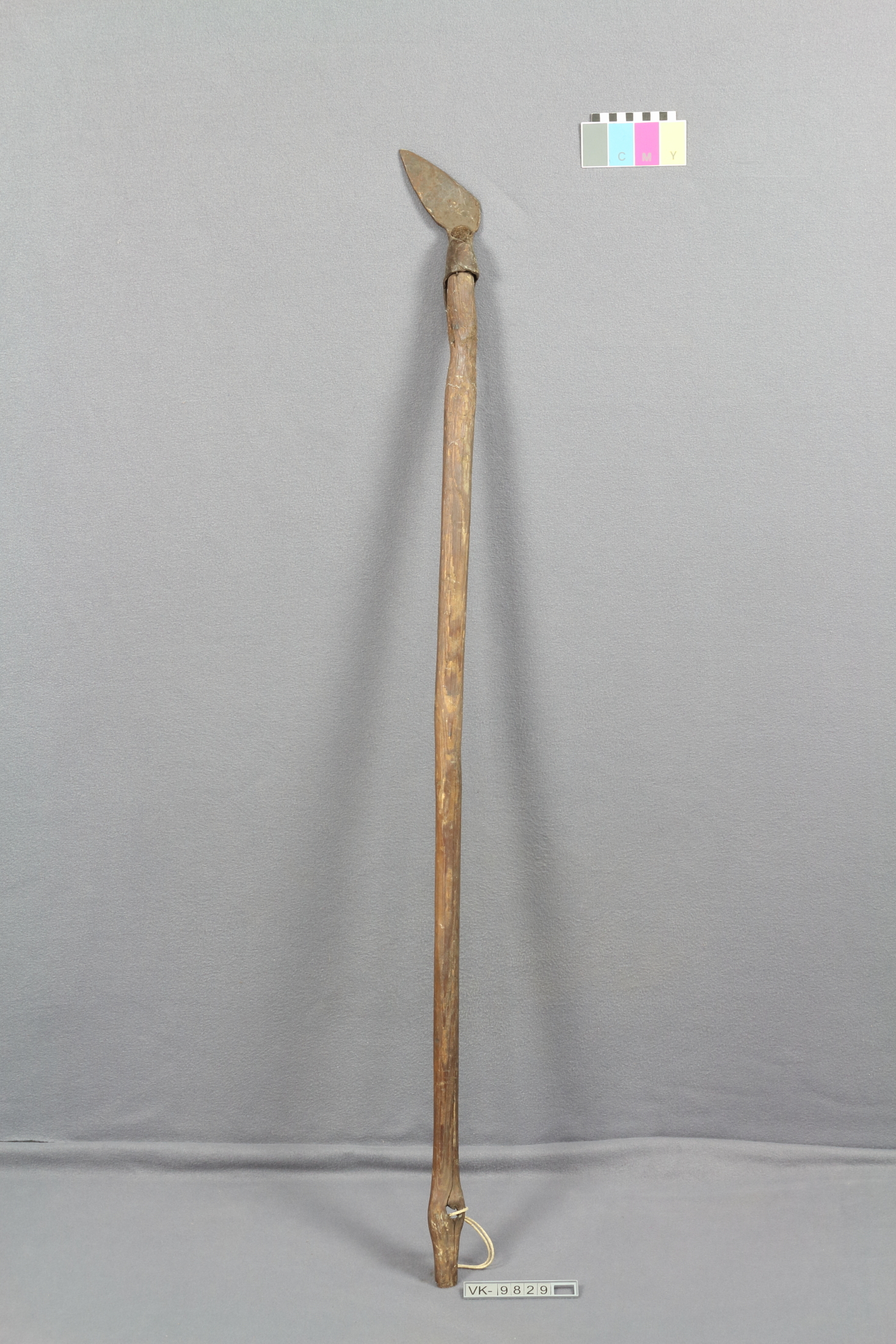 Pflugrandl: Tropfenförmige Eisenklinge mit angeschmiedeter Tülle an einem langen Holzstiel.