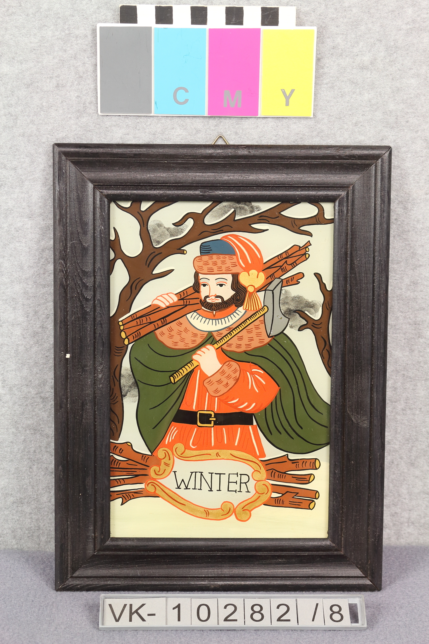 Hinterglasbild mit einer mehrfärbigen Darstellung einer Winterallegorie: Männerfigur bei der Holzarbeit im Wald, warm gekleidet. Auf der Rückseite ist ein Stich abgedruckt, darunter ein Verweis auf die Nachfertigung des Bildes. Das Bild wurde in überlieferter Technik nach einem Vorbild gemalt.