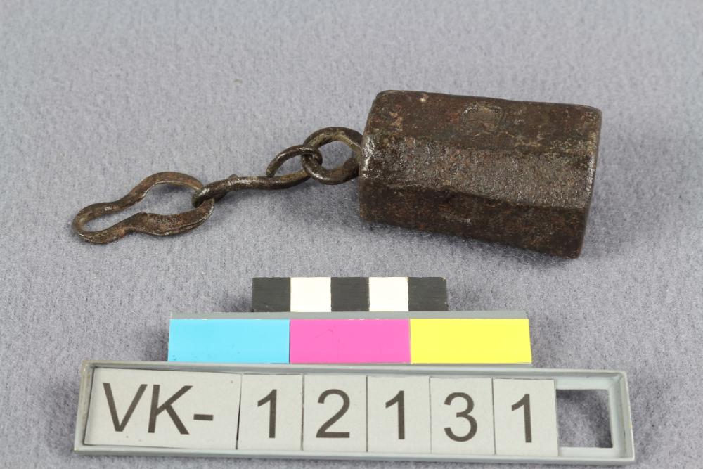 Achteckiges Gewicht mit Haken und Öse, Reste von Punzierungen sind erkennbar.