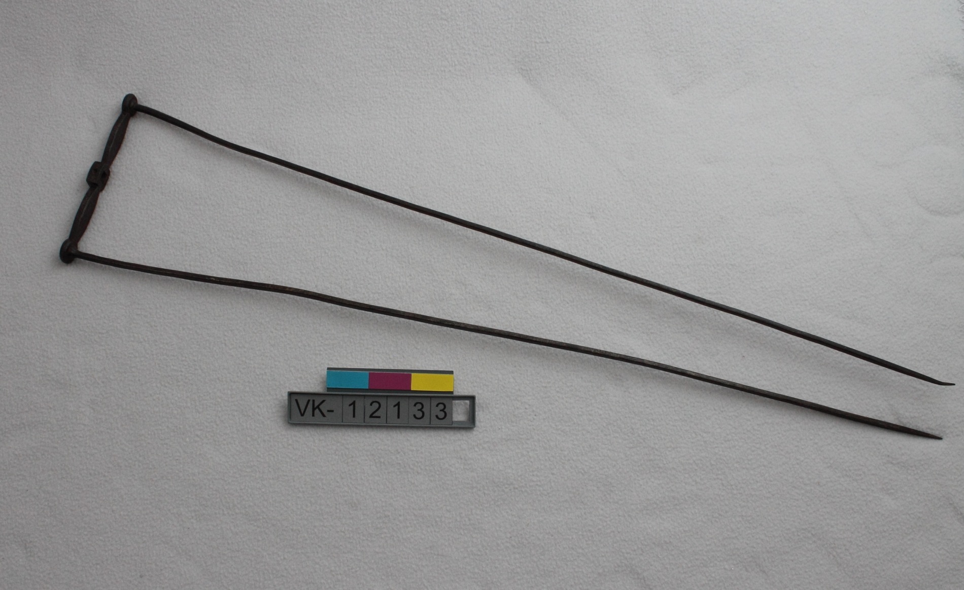 Teil einer Waage: Zwei schmale Eisenstäbe, zugespitzt, verbunden durch einen Steg mit Vierkantaufnahme.