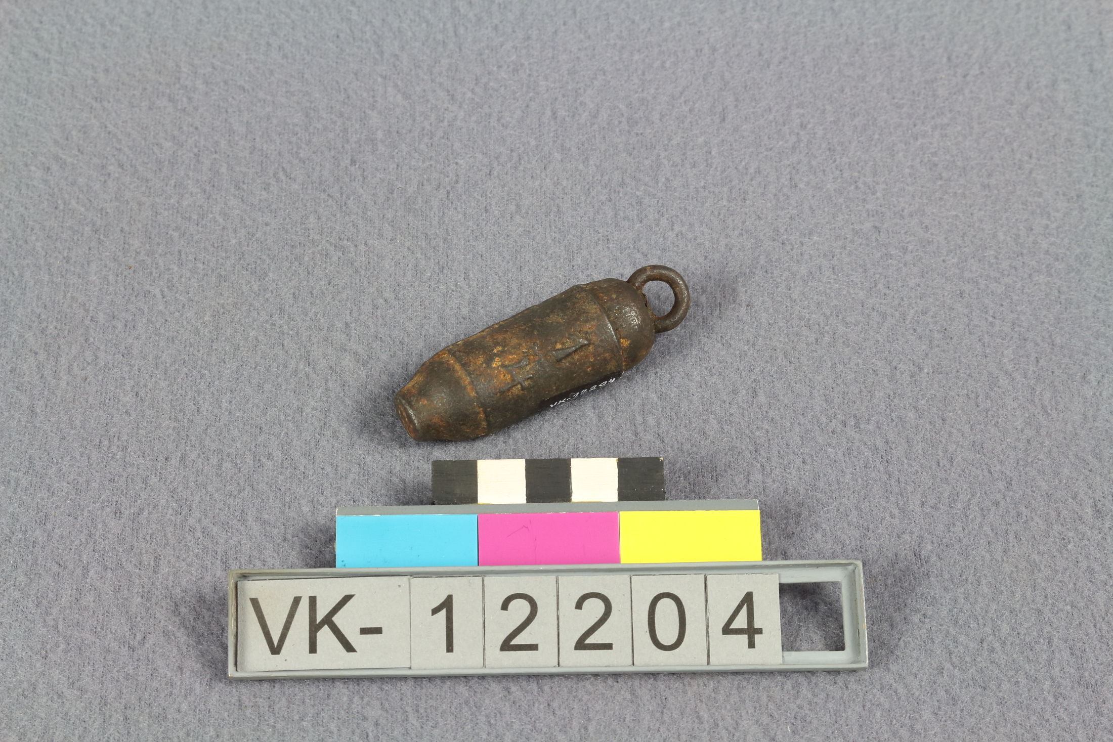Kleines rundes Uhrengewicht mit Öse und eingegossener Beschriftung: "1/4".