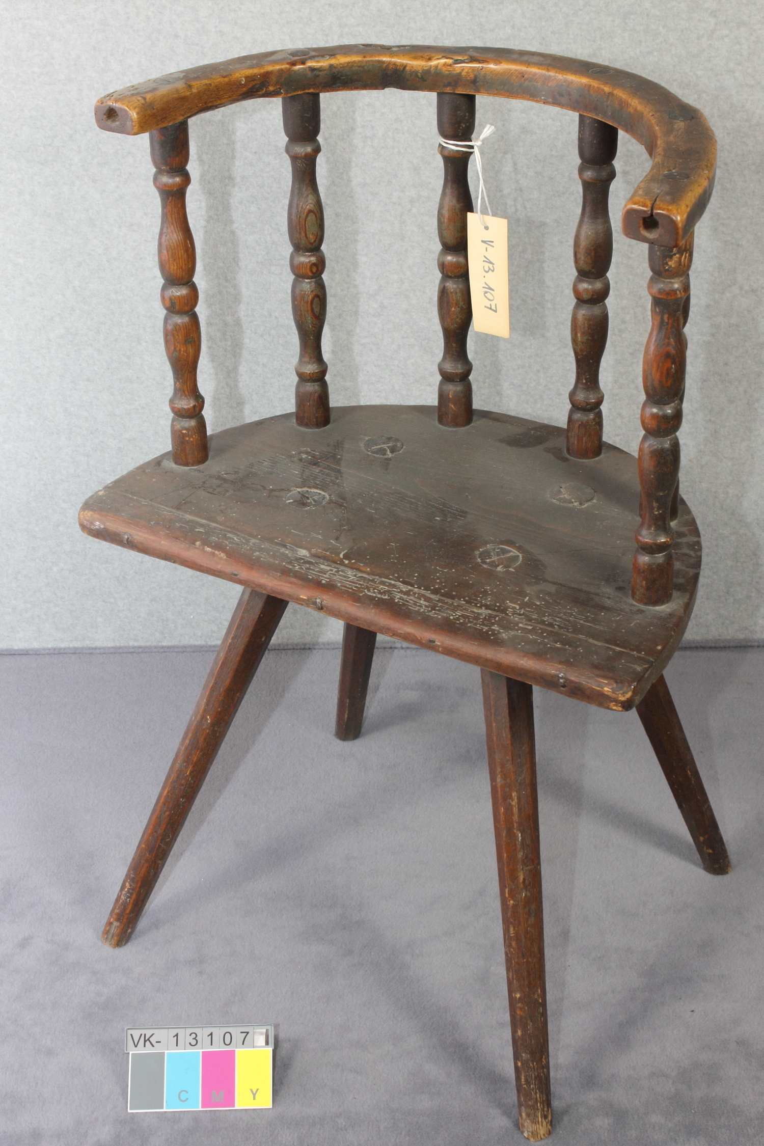 Sessel mit halbrunder Sitzfläche, einer Lehne aus sechs senkrechten gedrechselten Stäben und einer Querleiste sowie vier eingesteckten Füßen.