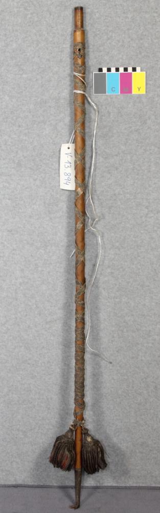 Taktstock aus Holz mit Metallbeschlägen: Silberborten um den Stab, eine Metallspitze unten. Im unteren Bereich sind zusätzlich zwei Quasten angebracht.