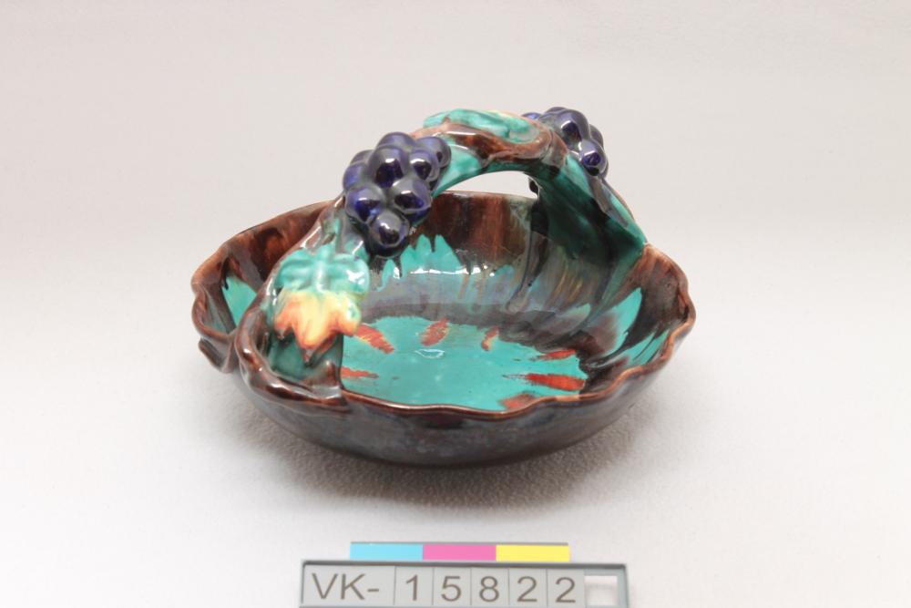 Mehrfärbig glasiertes (teilweise Laufglasur) Keramikkörbchen, rund mit einem Henkel, auf dem Trauben- und Weinlaubelemente angebracht sind.