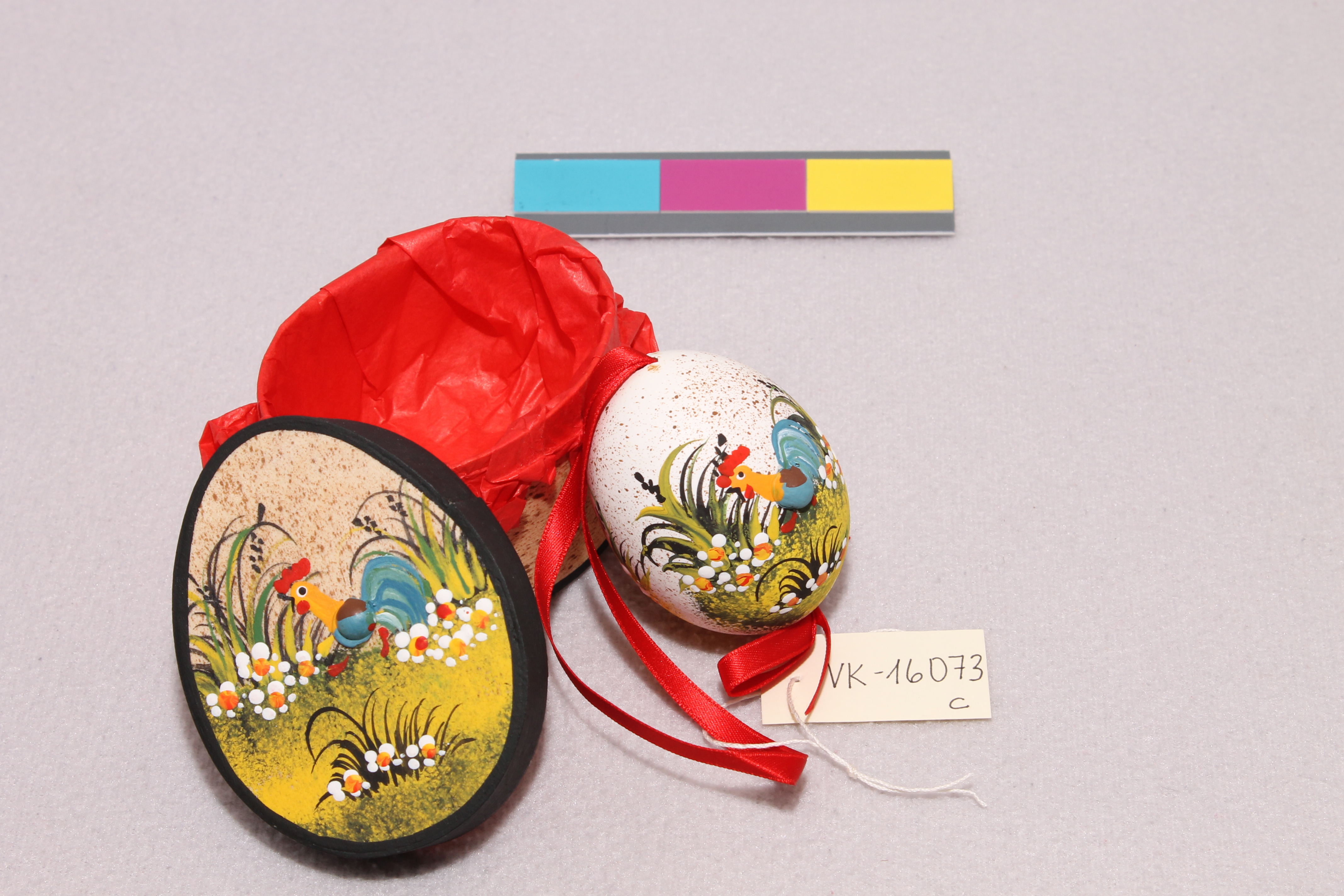 Schachtel mit eiförmigem Grundriss mit Deckel (a, b), darin ein Osterei (c). Die Schachtel ist aus Spanholz, ausgekleidet mit rotem Seidenpapier; auf dem Deckel ist ein Hühnermotiv gemalt. Das Ei ist ebenso bemalt und hat ein rotes Bändchen zum Aufhängen.