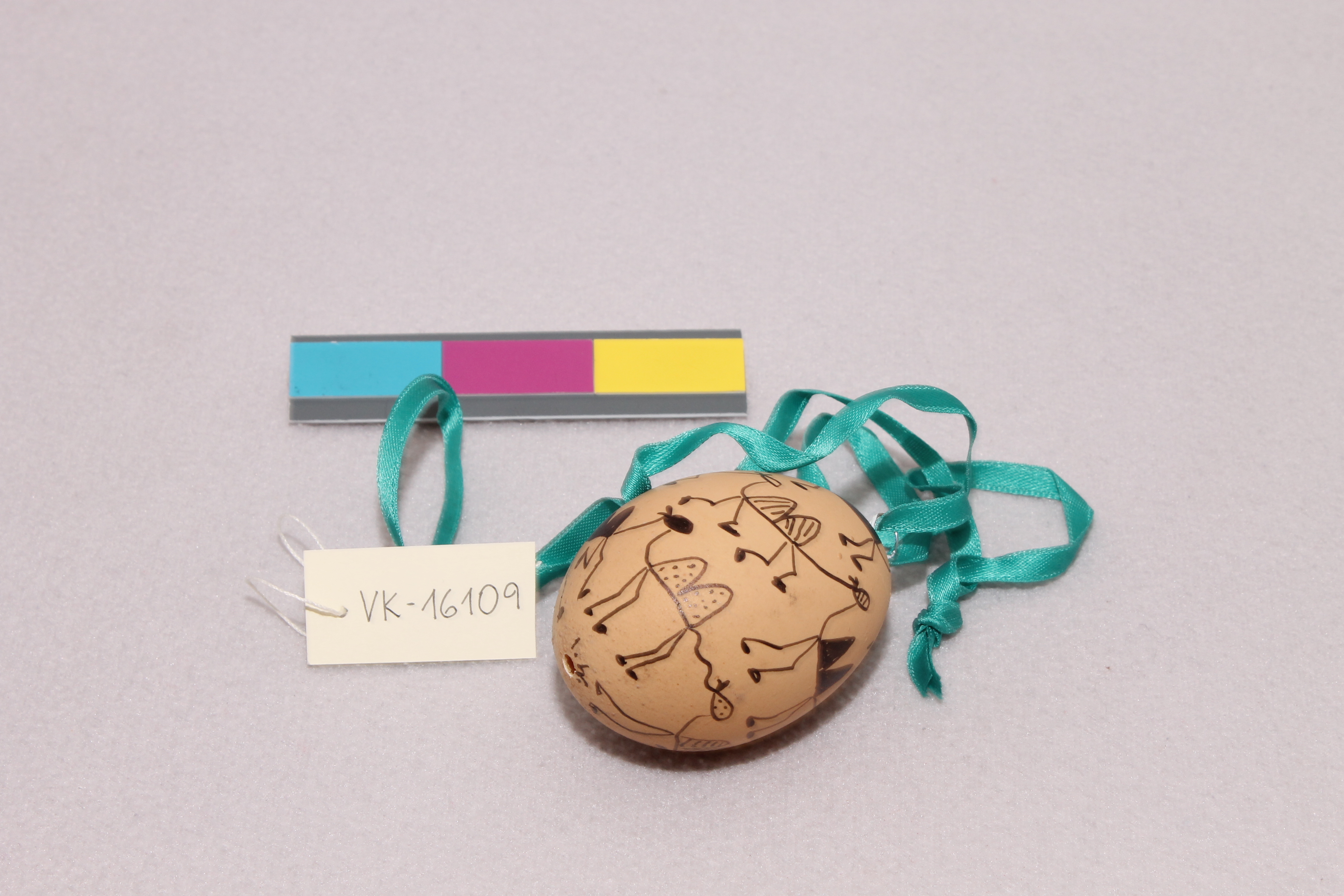 Osterei, ausgeblasen mit einem türkisfarbenen Bändchen; das braune Ei ist ungefärbt und mit Fizstiftzeichnung verziert (Dromedare). An einer Öffnung Initialen: "I. W.".