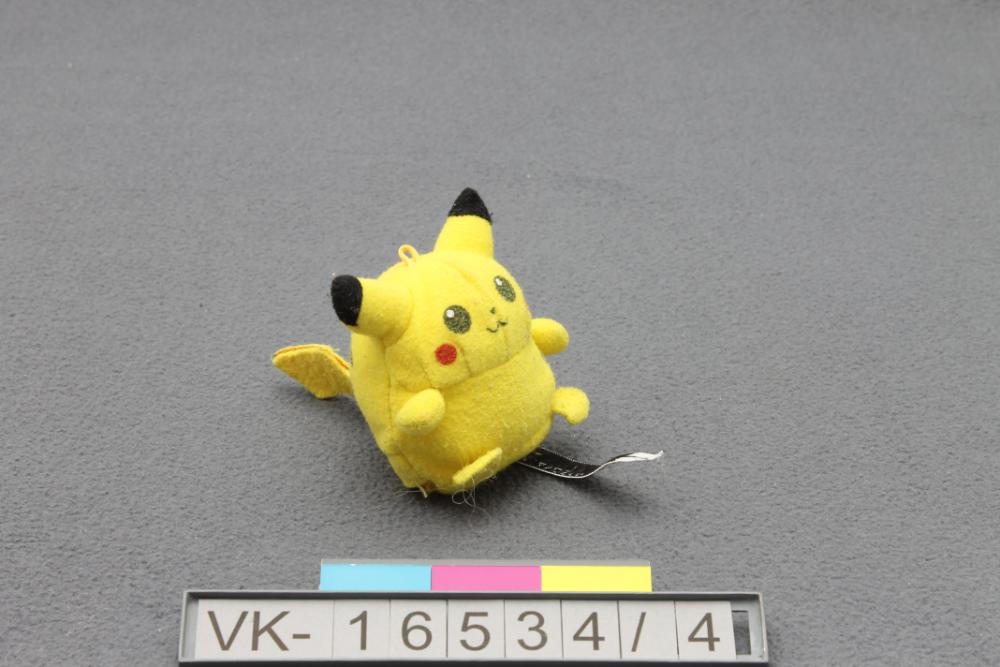 Sitzende Fantasietierfigur, mausartig, gelb mit schwarzen Akzenten: "Pikachu" aus dem Computerspiel bzw. der Fernsehserie "Pokemon" von Nintendo. Auf der Rückseite ist unter einem Klettverschluss ein Geräuschmodul mit Druckknopf in einem Kunststoffgehäuse eingesetzt, Betrieb durch drei Knopfzellen.