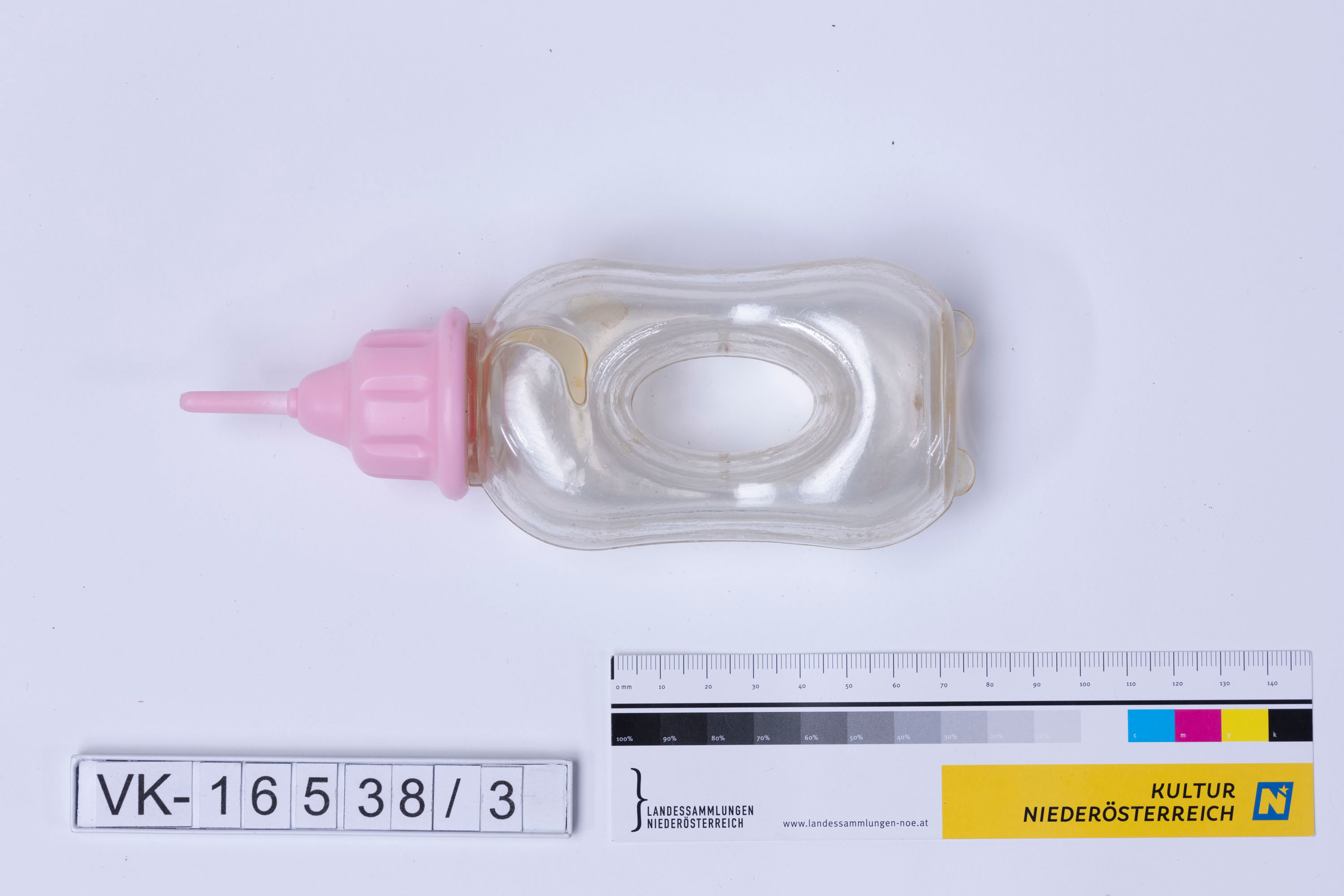 Puppenfläschchen mit rosa Verschluss (mit einer Tülle) und transparentem Fläschchen, das in der Mitte eine Aussparung als Griffloch hat. Auf dem Fläschchen ist eine mattierte Beschriftung: "Zapf Creation". Das Objekt befindet sich auf dem Restaurierungstisch.