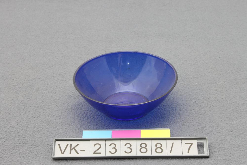 Kleine dunkelblau-transparente Kunststoffschüssel mit Standring. Auf dem Boden eine eingegossene Beschriftung: "ETO König & Komp. Villach".