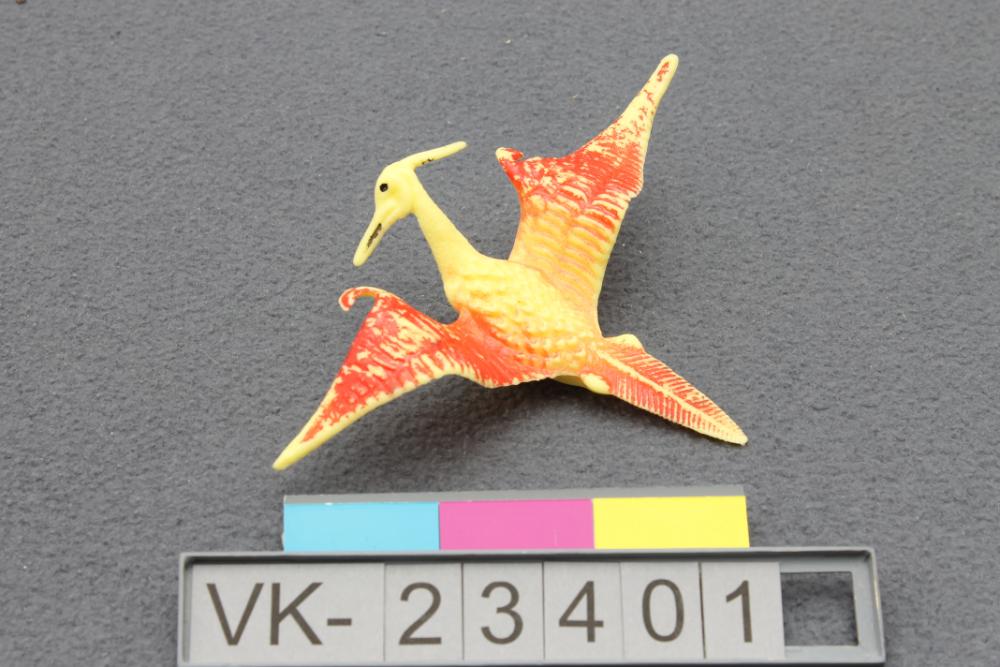 Gelbes Spielzeugtier aus Kunststoff mit roten Teilbereichen: Flugsaurier.