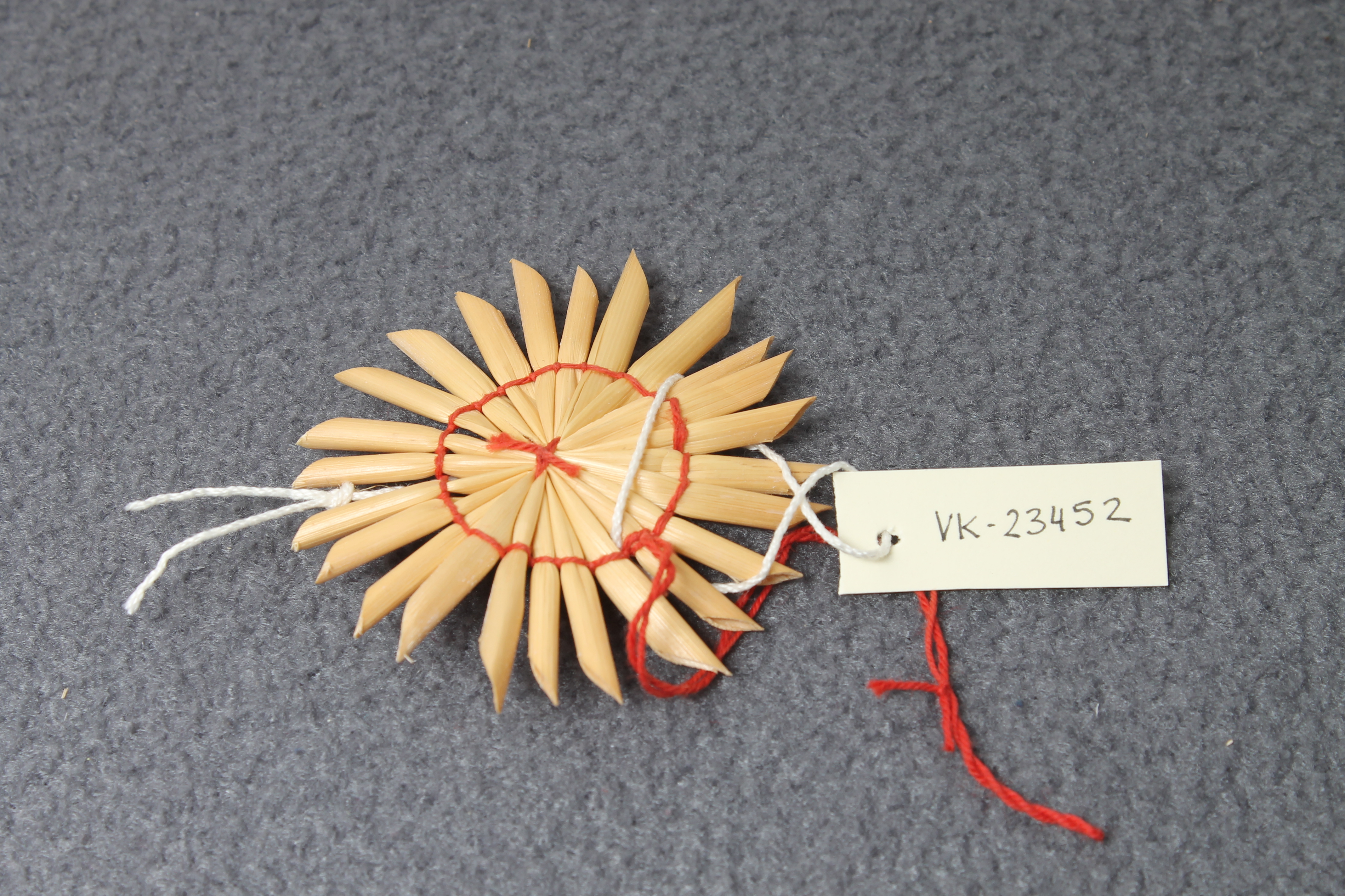Einfacher Strohstern, mit rotem Garn gebunden und einem Aufhängebändchen. Die Sterne VK-23452 bis VK-23455 sind sehr ähnlich.