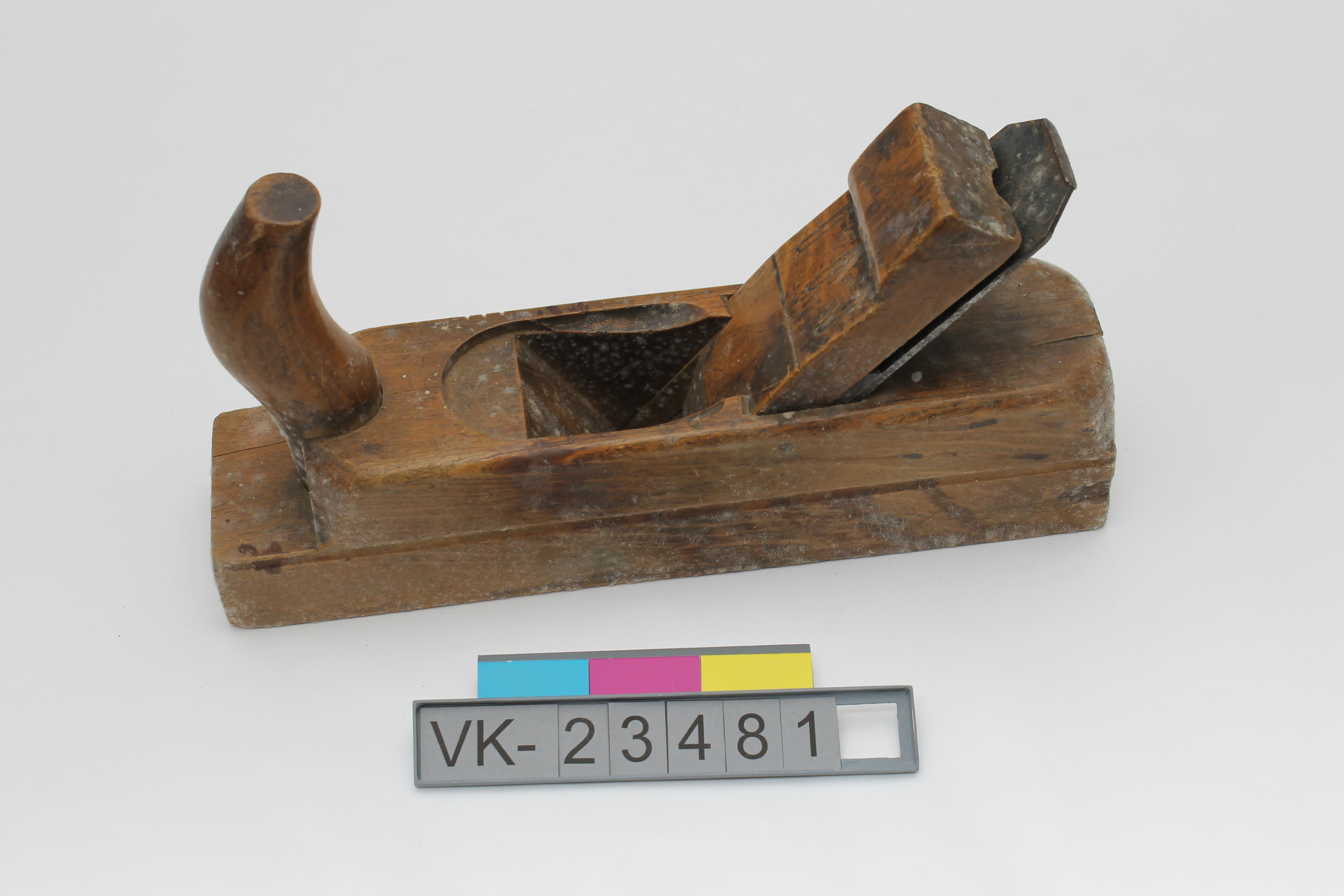Hobel aus Holz mit geschwungener Hobelnase und einem Hobeleisen mit Verstellschraube und Keilwiderlager. Der Hobel hat eine eingeprägte Beschriftung: "JOH. WEISS & SOHN WIEN". Das Objekt wurde wegen starkem Schimmelbefall ausgesondert und befindet sich nun in einer Schimmelkiste.