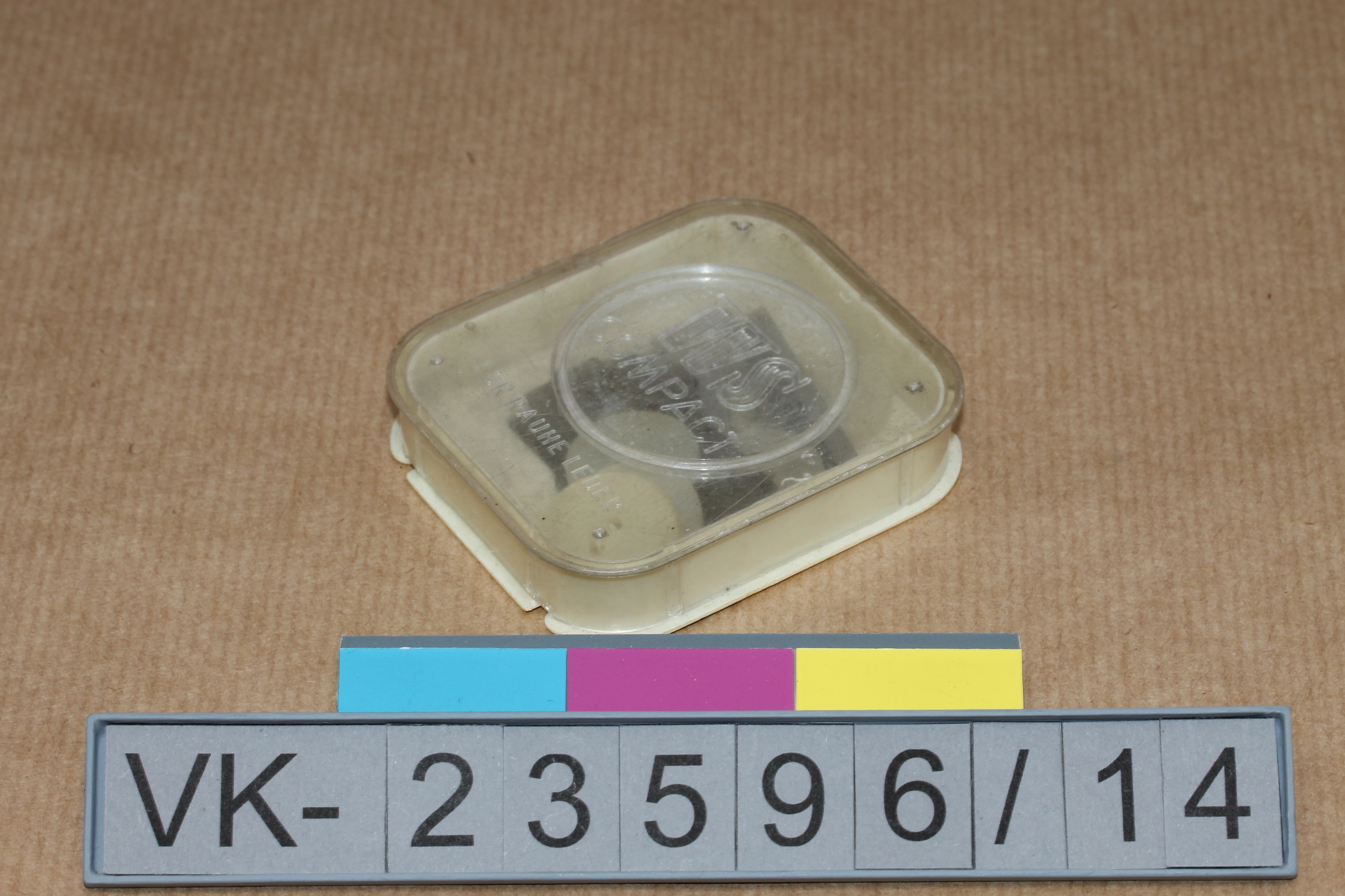 Kuststoffschachtel, weiß mit transparentem Deckel mit einer eingegossenen Beschriftung: "WS COMPACT FÜR RAUHE LEDER". Die Schachtel enthält Knöpfe und Rasierklingen. Das Objekt befindet sich auf dem Restaurierungstisch.
