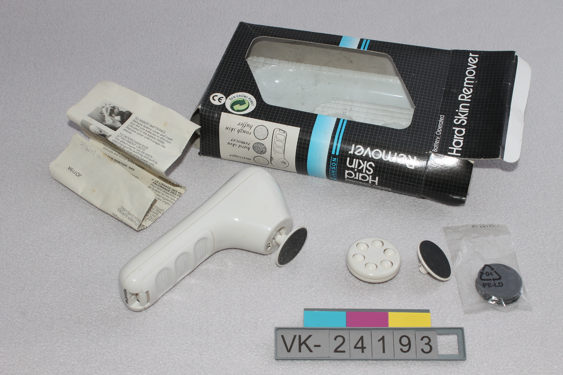 Batteriebetriebenes Schleif- und Massagegerät (VK-24193a) zur Hornhautentfernung. Das Gerät ist aus weißem Kunststoff, hat ein Batteriefach und eine Antriebsachse, auf die verschiedene Drehteller (VK-24193b und VK-24193c) zum Schleifen oder Massieren gesteckt werden können. Zu dem Gerät gibt es eine Schachtel (VK-24193f), eine Betriebsanleitung ((VK-24193e) und Ersatz-Schleifblätter in einem Säckchen (VK-24193d).
