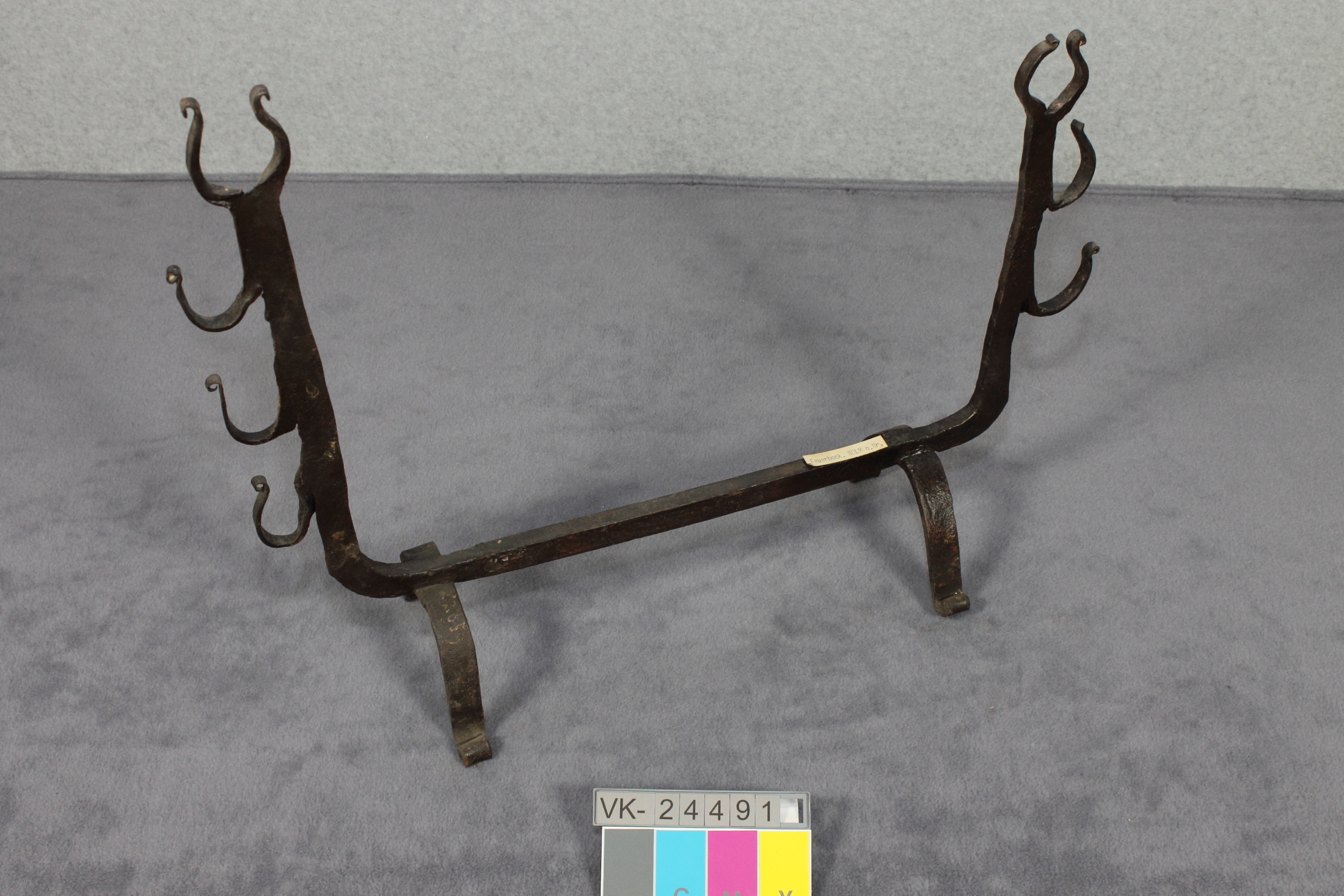 Feuerbock (Feuerhund) aus Schmiedeeisen, mit einer waagrechten und zwei senkrechten Streben, an einer davon drei seitliche Haken und ein Doppelhaken am Ende, an der anderen zwei seitliche Haken und ein Doppelhaken am Ende. Der Feuerbock hat vier Füße.
