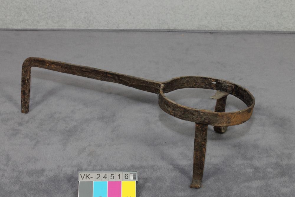 Pfannenuntersetzer (Pfannenknecht) aus Schmiedeeisen mit drei Füßen und ringförmiger Auflage.