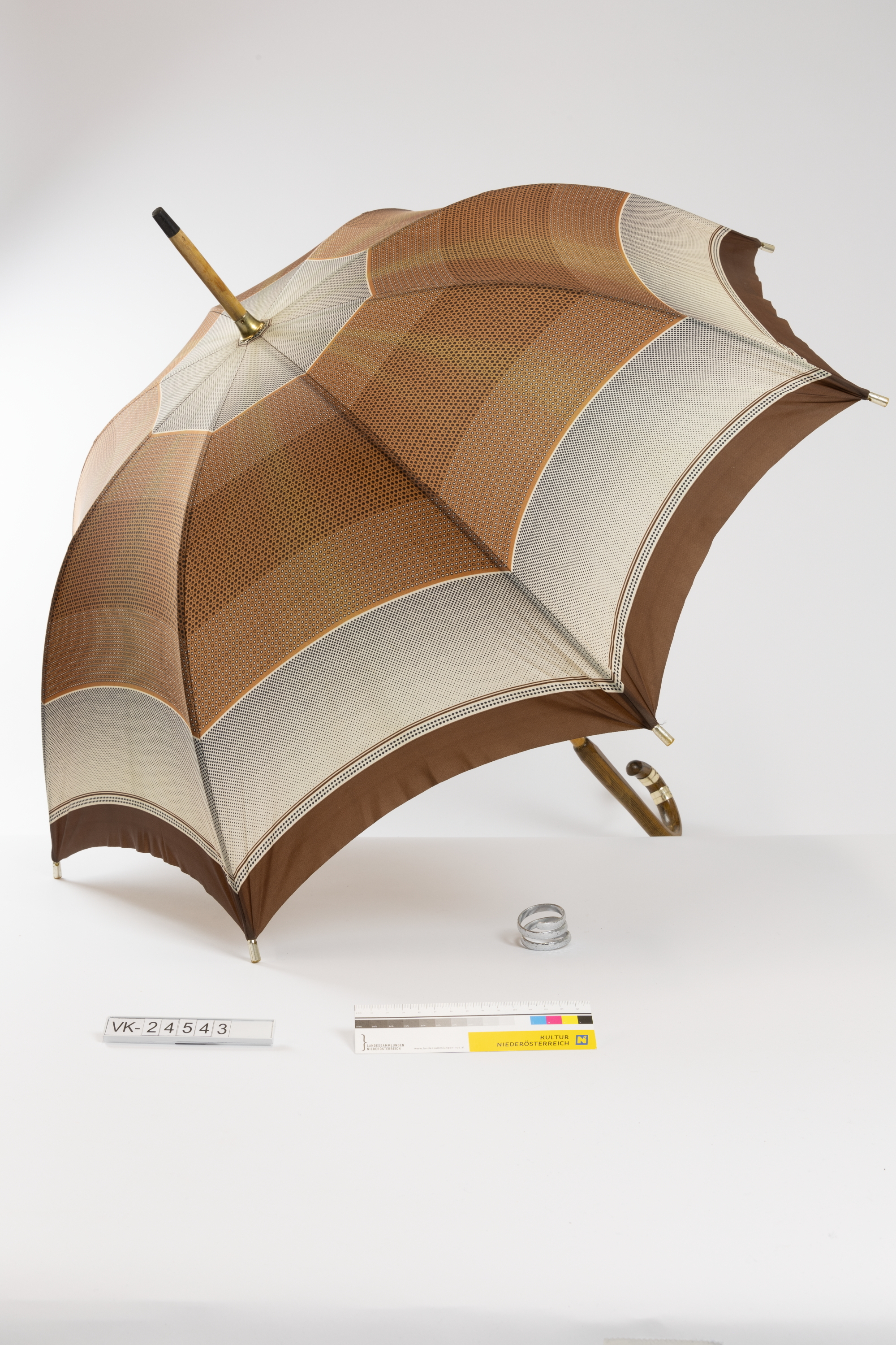Regenschirm mit Holzstock und gebogenem Holzgriff, der mit vier silbernen Ringen verziert ist. Die Bespannung ist braun und hellgrau mit einem feinen Muster.