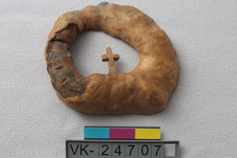 Beschnitztes und geschliffenes Astloch eines Baums; der Holzring mit halbrundem Profil ist an einer Stelle so beschnitzt, dass ein Kreuz in der Öffnung steht. Auf der Rückseite ist eine Öse zum Aufhängen.