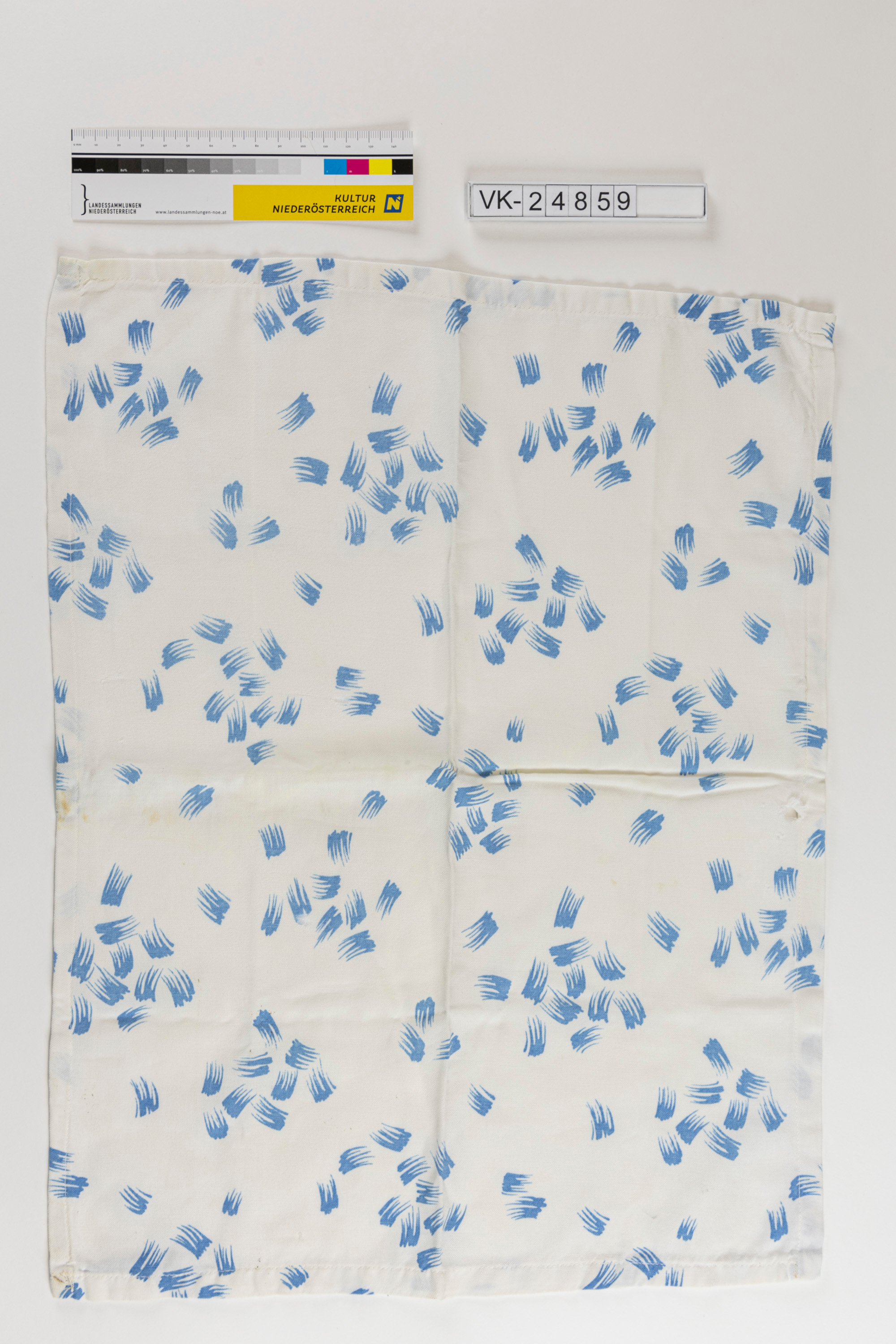 Rechteckiges Taschentuch aus weißem Baumwollleinen, bedruckt mit abstrakten blauen Musterelementen.