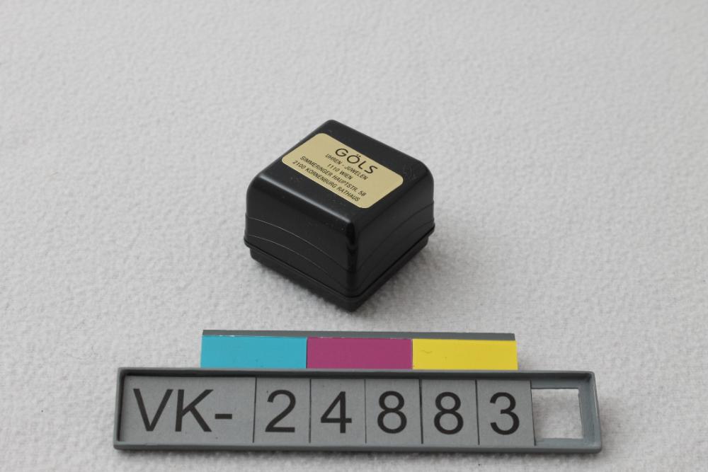Schatulle aus schwarzem Kunststoff (VK-24883a) mit Deckel (VK-24883b), darauf ein goldfarbener Aufkleber mit Beschriftung: "GÖLS UHREN-JUWELEN 1110 WIEN...". Innen befindet sich ein Einsatz für Ohrstecker. Das Objekt befindet sich in der Schatulle mit der Inventarnummer VK-24881.
