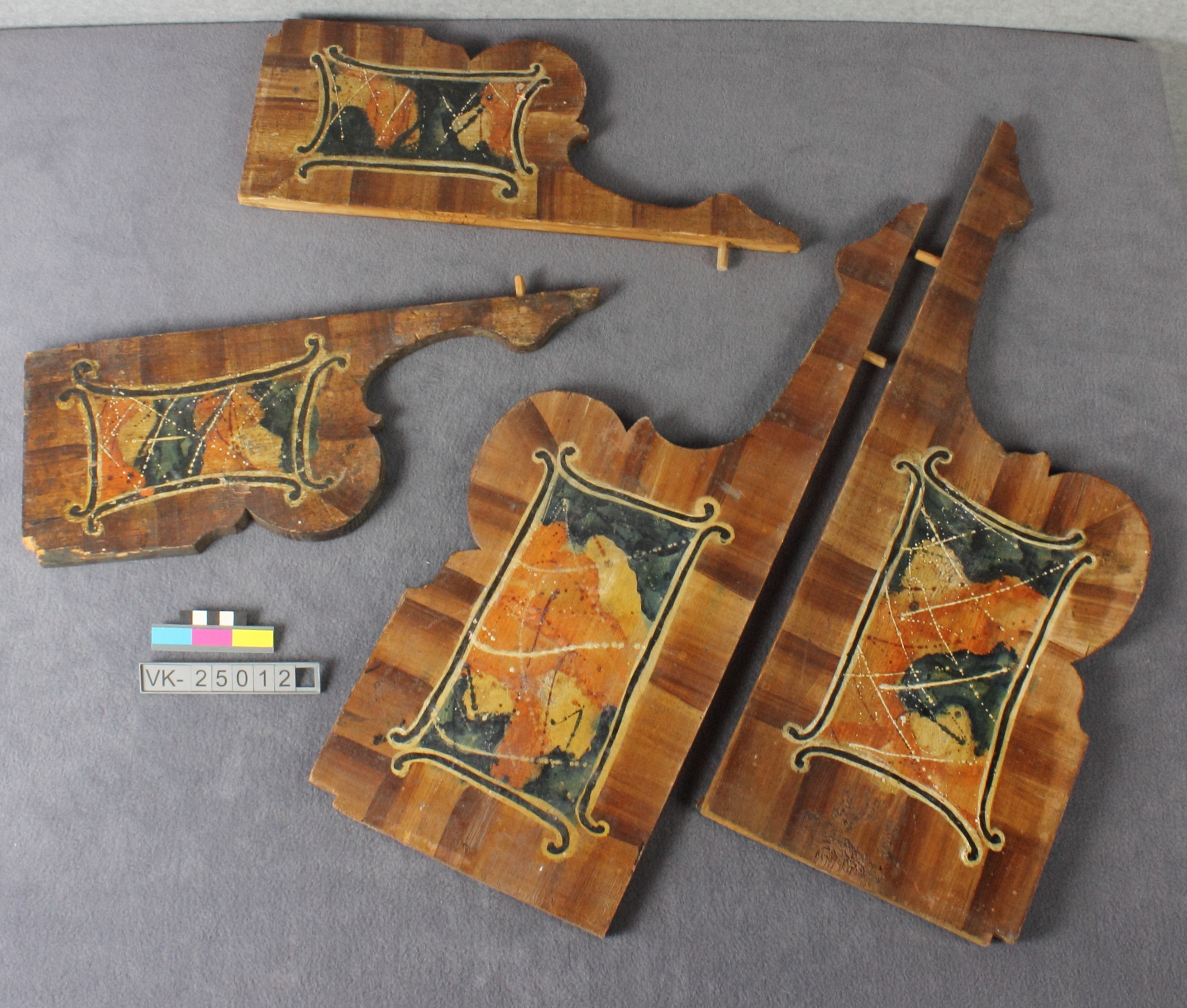 Vier Bettteile (Seitenteile), geschweift ausgeschnitten und mehrfärbig bemalt: Braune Furniermalerei, gerahmte Felder mit Mustern. Die Teile a, b und c, d sind jeweils gleich groß.
