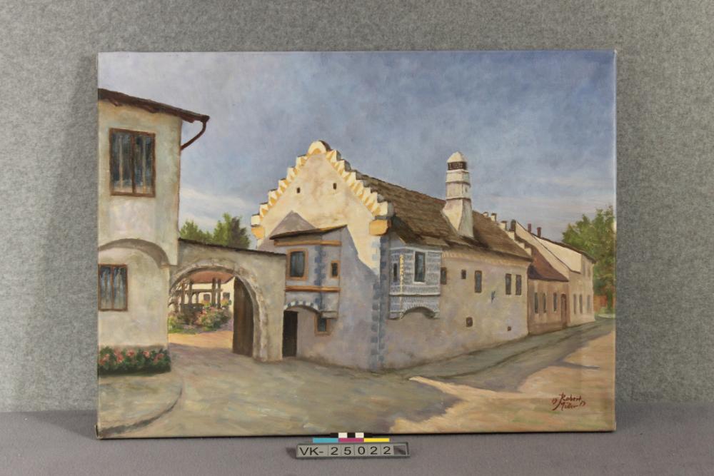 Bild (Acryl auf Leinwand): Ortsansicht mit Hofeinfahrt (Haus mit verziertem Giebel und Erker), signiert Robert Müller 1979.