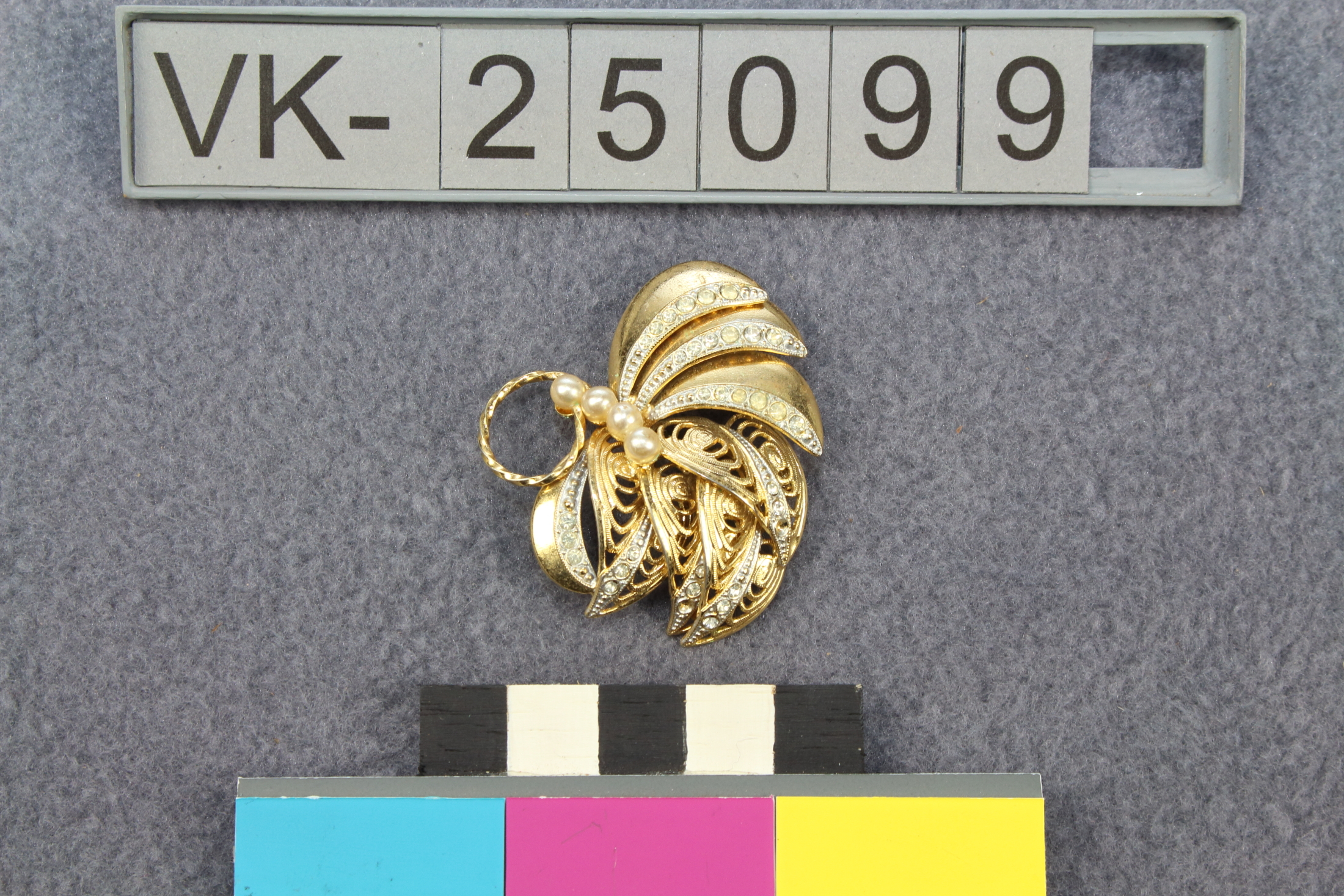 Fächerartige vergoldete Brosche mit Strassbesatz und vier Kunststoffperlen. Das Objekt befindet sich in der Keksdose mit der Inventarnummer VK-25120.