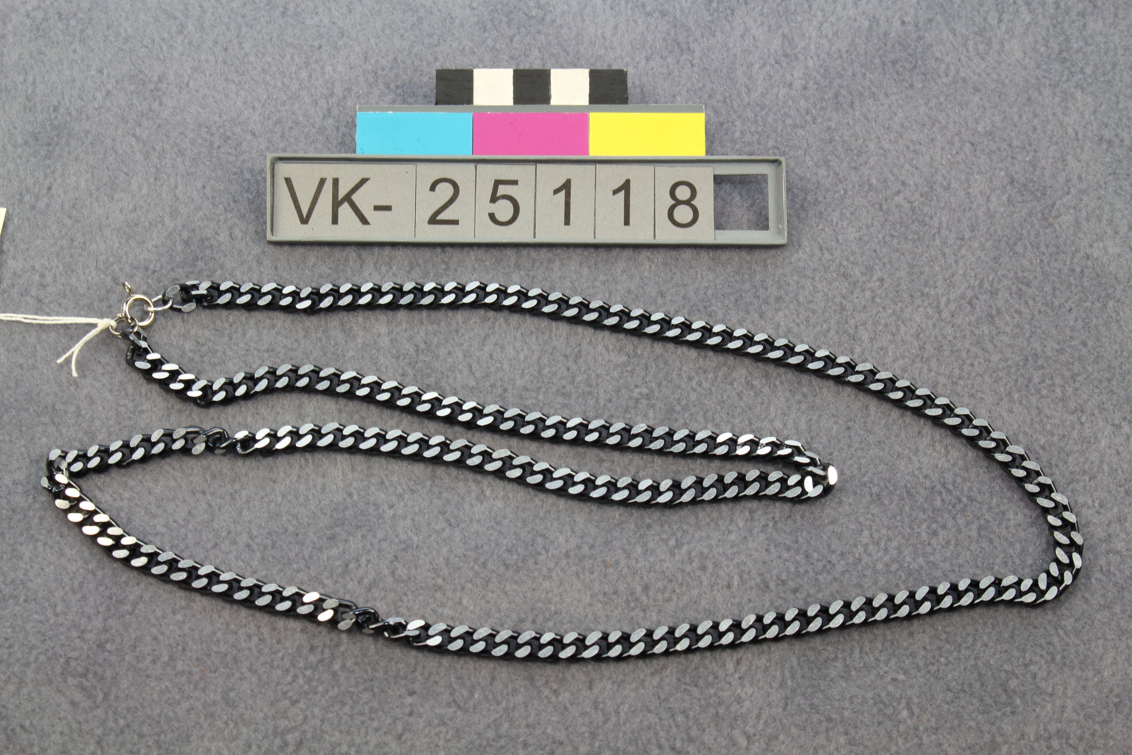 Teilweise dunkelblau lackierte Halskette (Panzerkette) mit Federringverschluss. Das Objekt befindet sich in der Keksdose mit der Inventarnummer VK-25120.