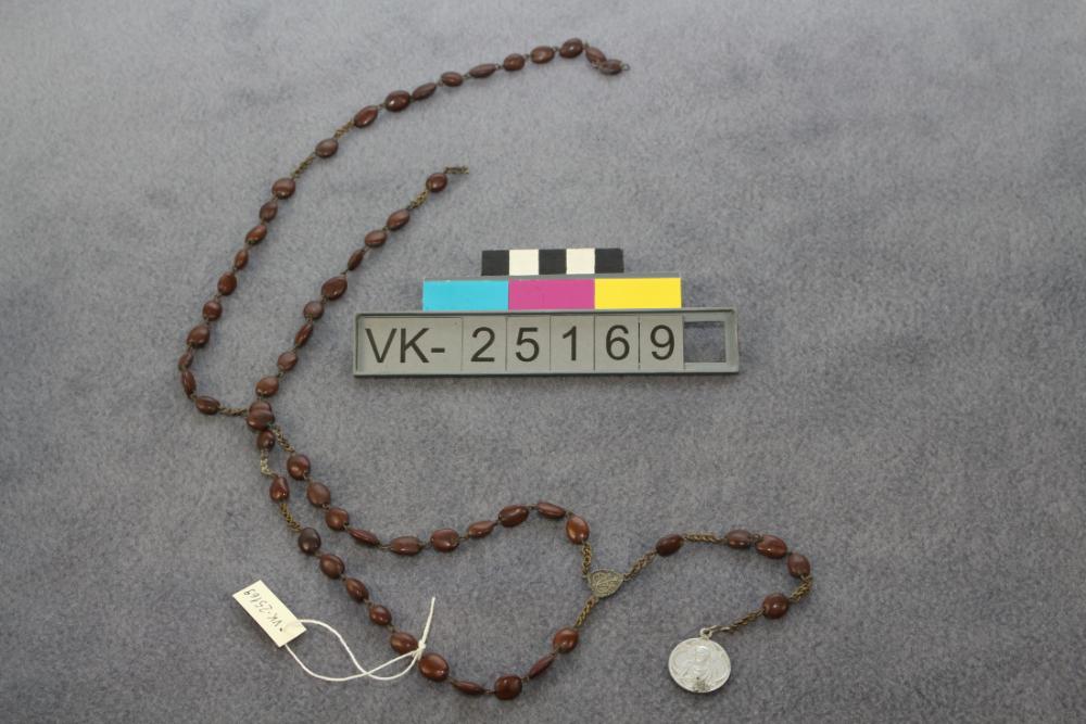 Rosenkranz mit braunen Holzperlen an einem Messingdrahtkettchen, mit Herzstück (Maria und Marienmonogramm) und einem runden Anhänger mit Maria mit Kind und Herz Jesu. Das Objekt befindet sich in der Schatulle mit der Inventarnummer VK-25149.