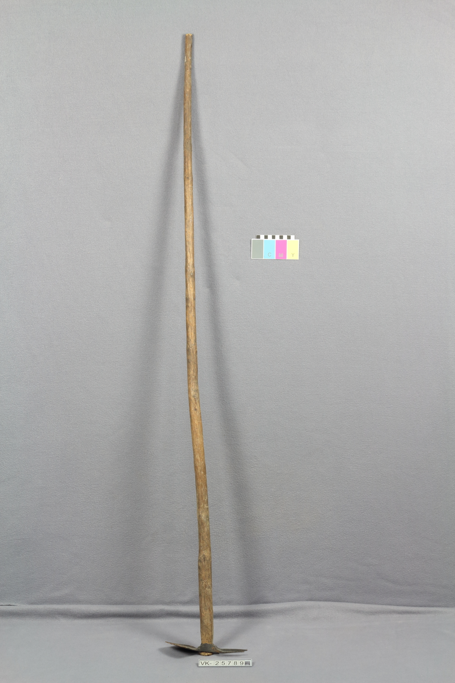 Heindl mit Blatt und Karst an einem langen Holzstiel.