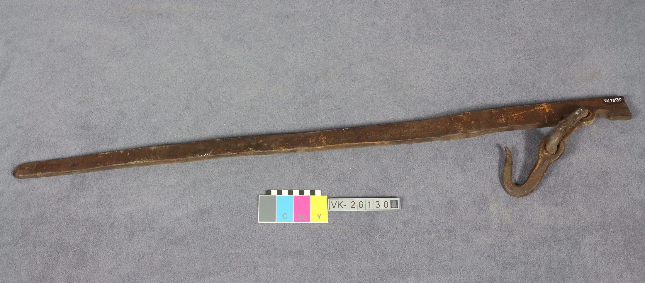 Geräteteil: Spitz zulaufende Eisenstange mit Öse und Haken.