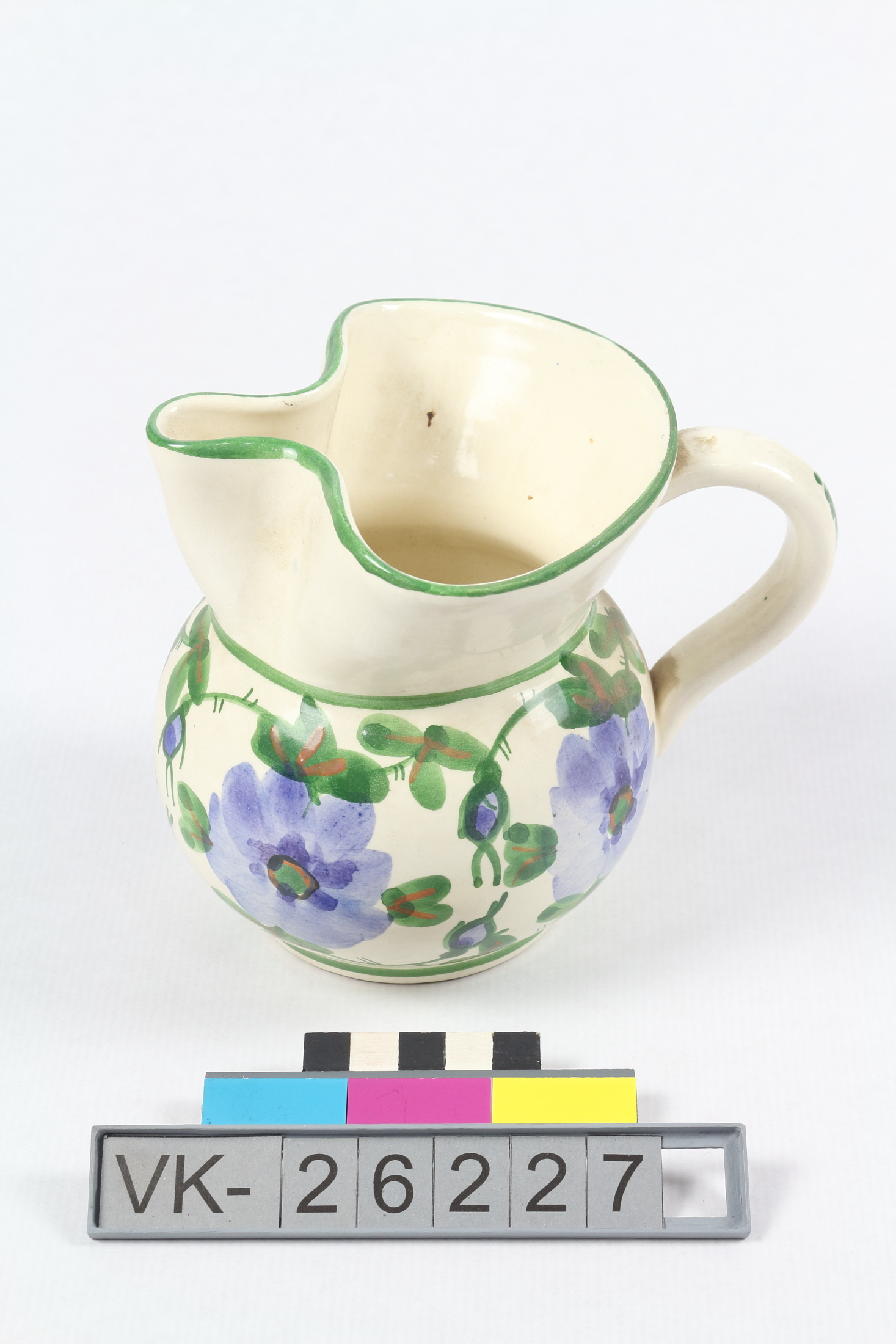 Bauchige Kanne mit schulterständigem Henkel, ausgestelltem Rand und Kleeblattmündung; der Bauch ist auf weißem Grund umlaufend floral mit blauen Blüten und Blattwerk bemalt. Bodenmarke: "MAJOLIKA CELSIA".