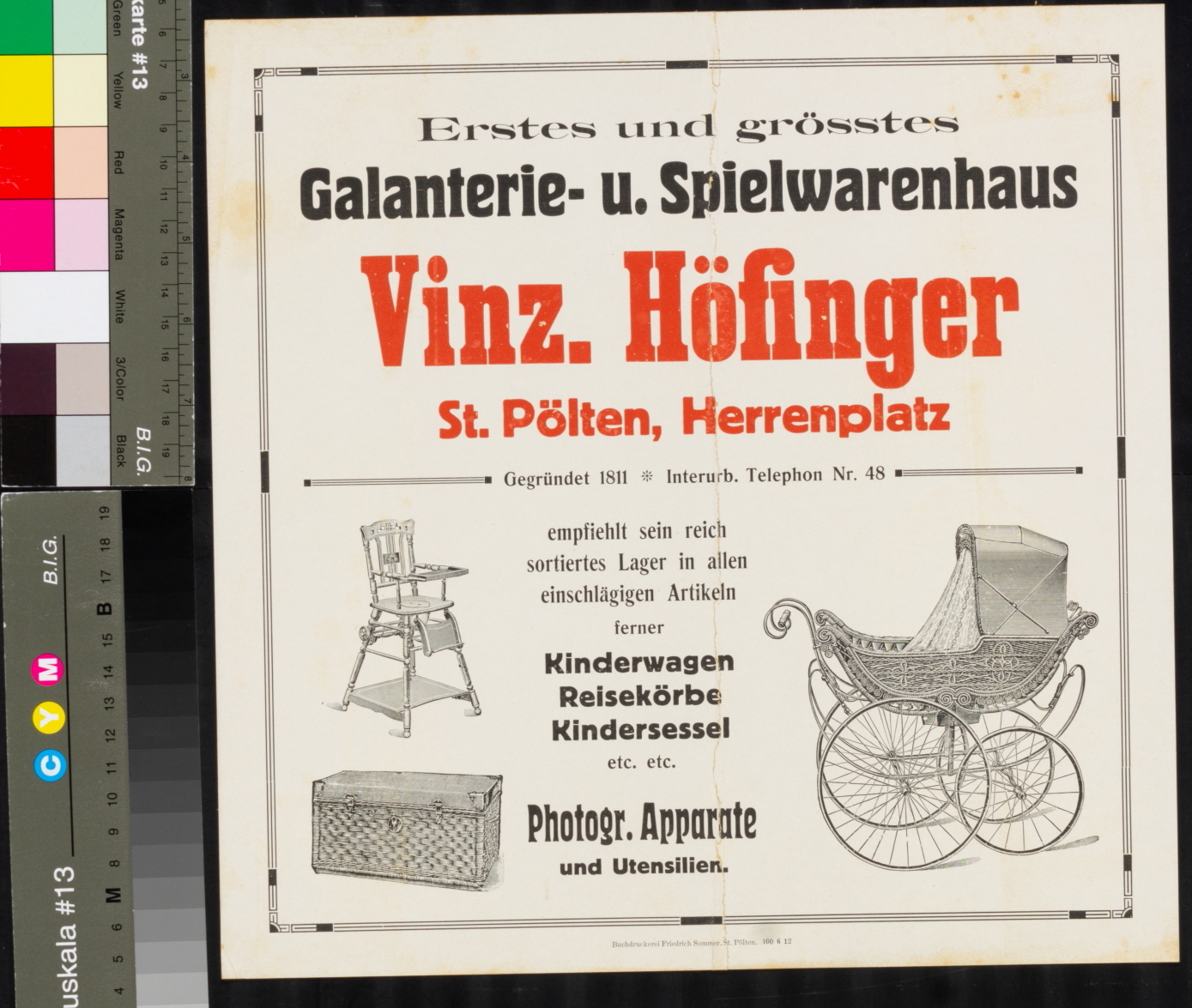 Werbung, Galanterie- und Spielwarenhaus des Vinzenz Höfinger, St. Pölten, Herrenplatz