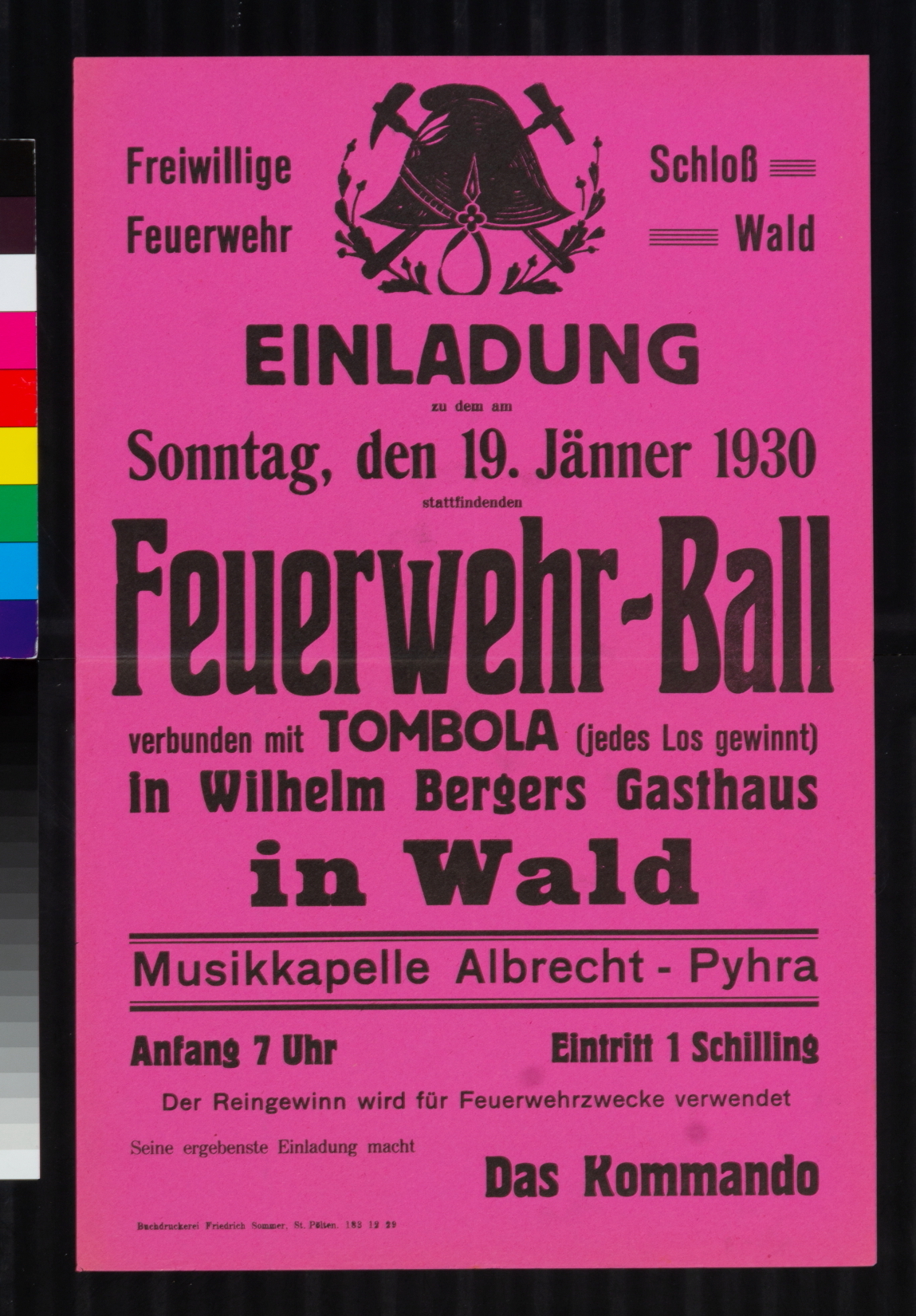 Einladung, Feuerwehrball freiwillige Feuerwehr Wald im Schloss bei Pyhra, Gasthaus Wilhelm Berger, 19. Jänner 1930.