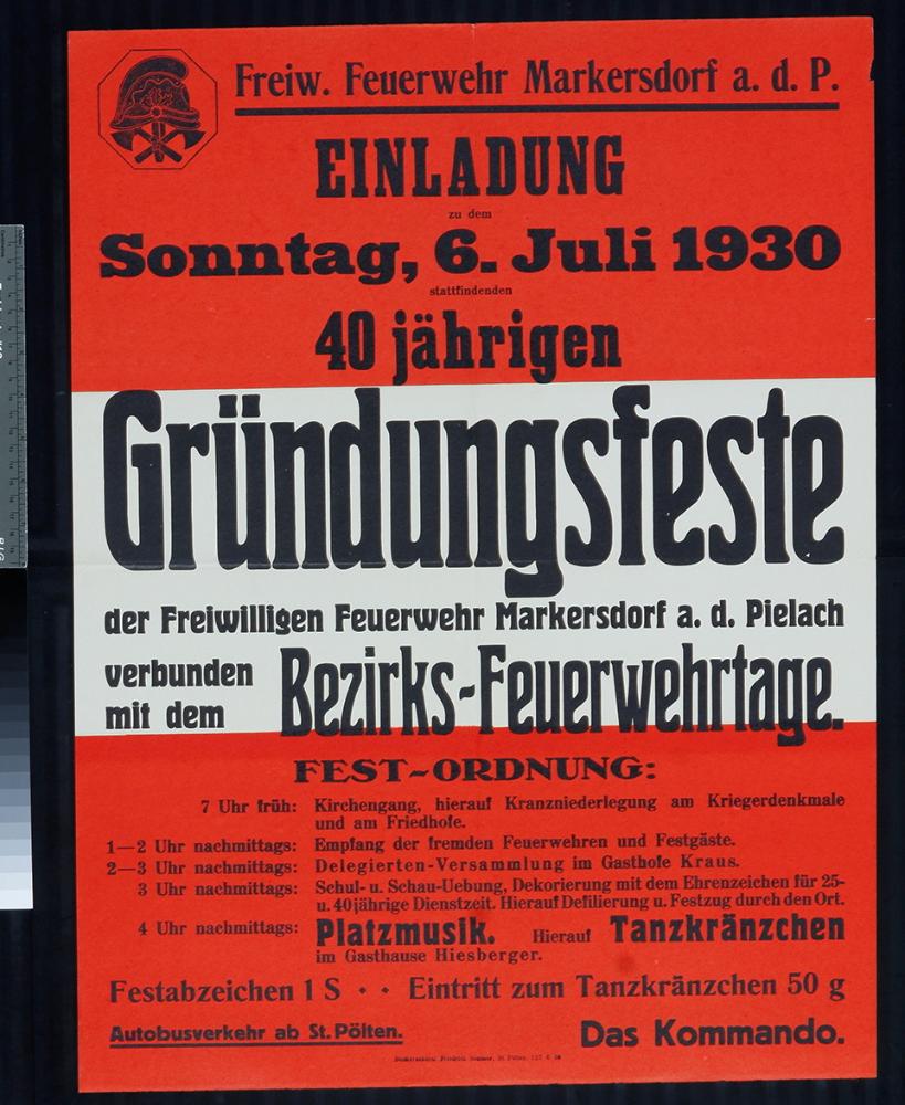 Einladung, 40 jähriges Gründungsfest der freiwilligen Feuerwehr Markersdorf, 6. Juli 1930.