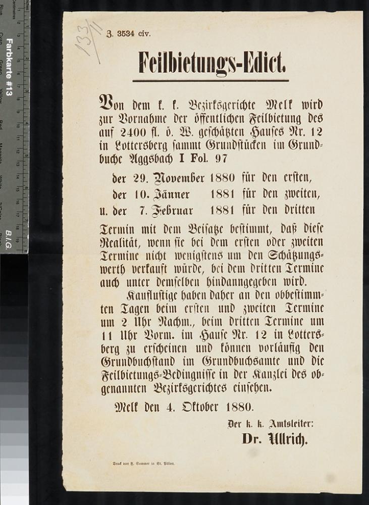 Feilbietunsedikt, Realität Lottersberg Haus Nr. 12, 4. Oktober 1880, k.k. Amtsleiter Dr. Ullrich, 4. Oktober 1880.
